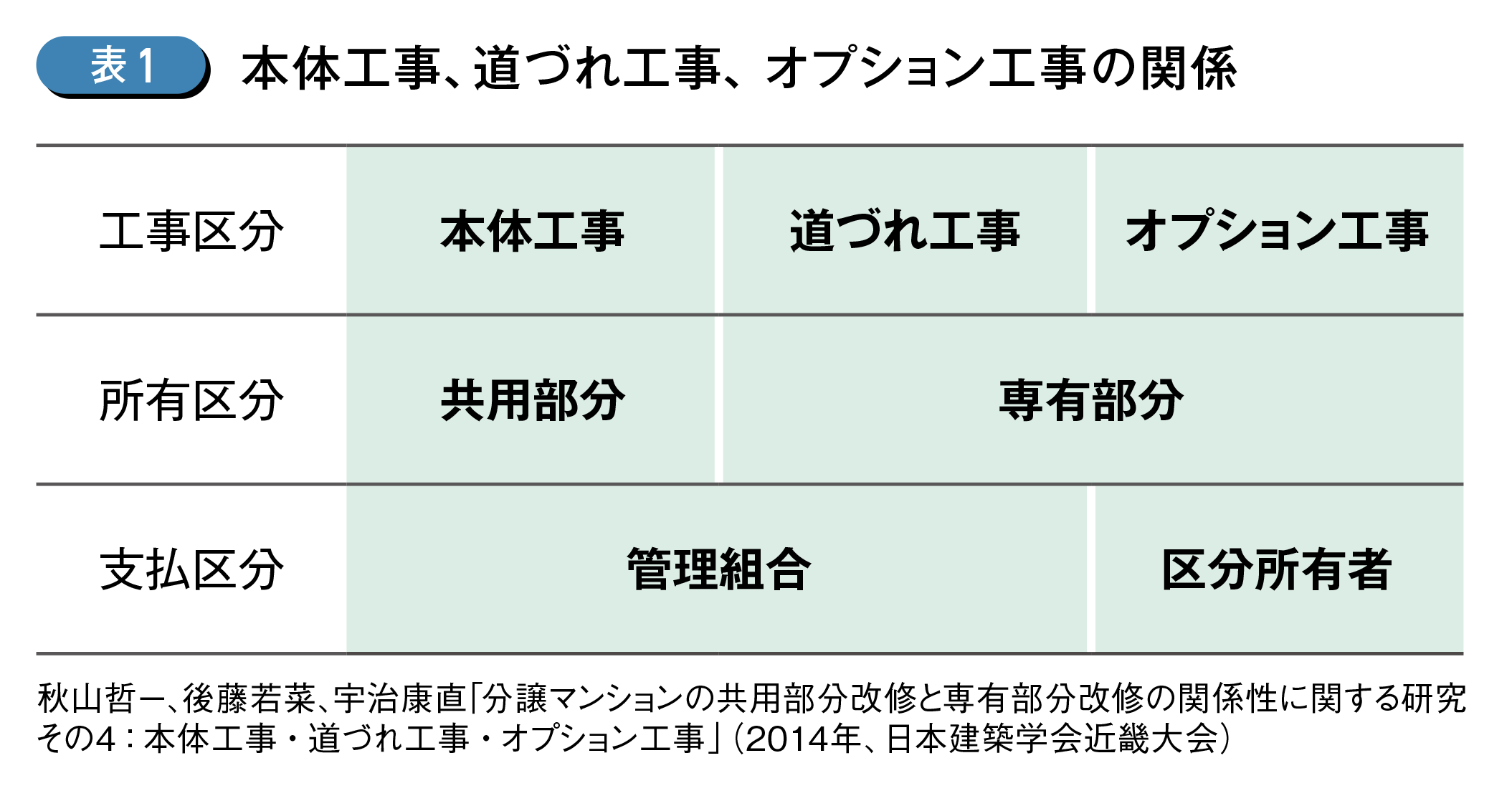 この竪管更新を「本体工事」とすると、壁床解体等は「道づれ工事」、台所リフォーム等は「オプション工事」という3つの工事に分けられるが、これらは表1のとおり所有区分と費用の支払い区分が全部異なっている。したがって、管理組合がその手順、考え方を示すなどの調整が重要である。