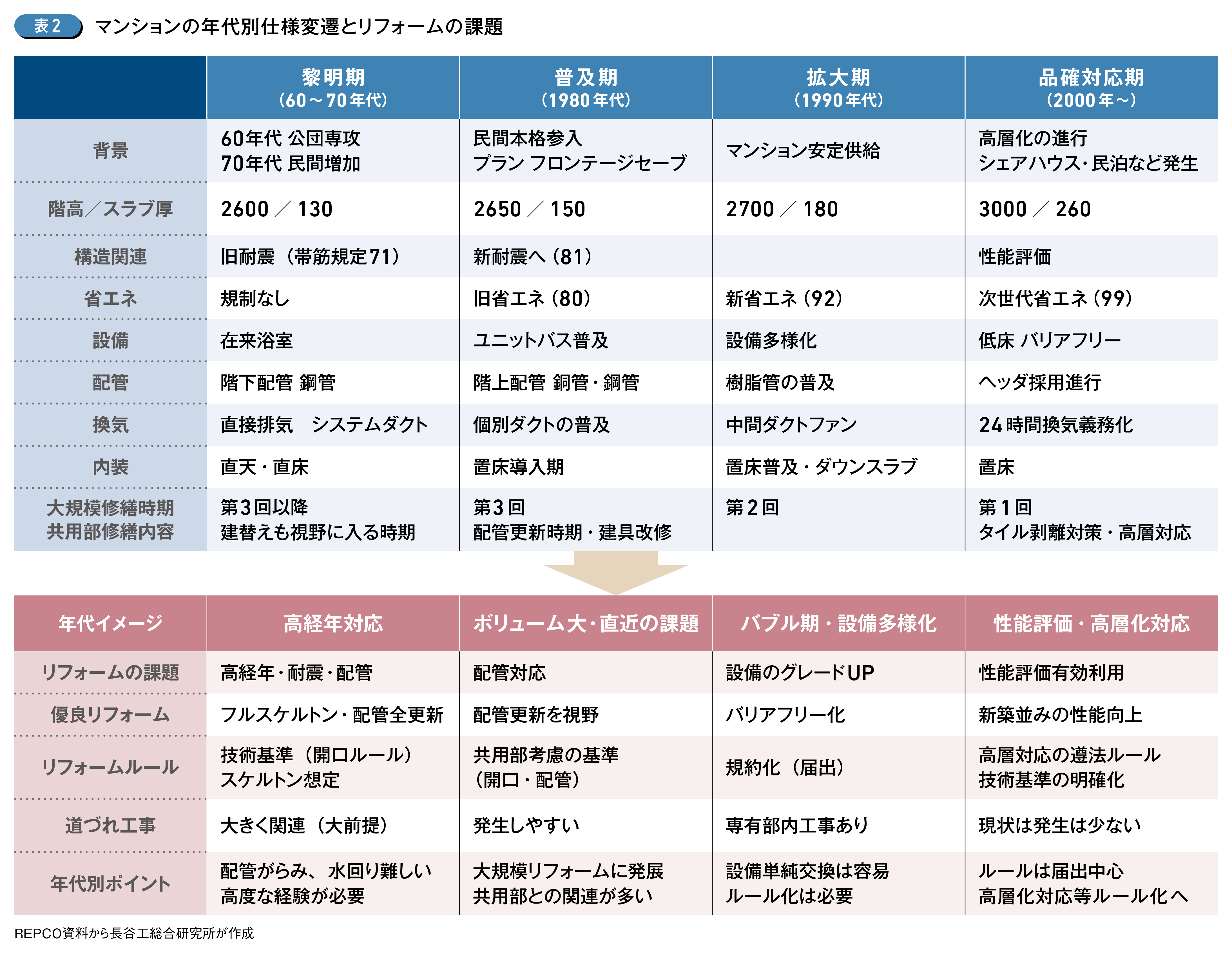 これらの問題について、長年研究してきたのが(一社)マンションリフォーム推進協議会(以下「REPCO」と表記)である。本件ではまずマンションが「供給年代別に仕様が異なる」ことについて、概ね10年ごとに平面形状や部位別に変遷を整理した。管理規約等のルールについても同様である。(※3)(表2)