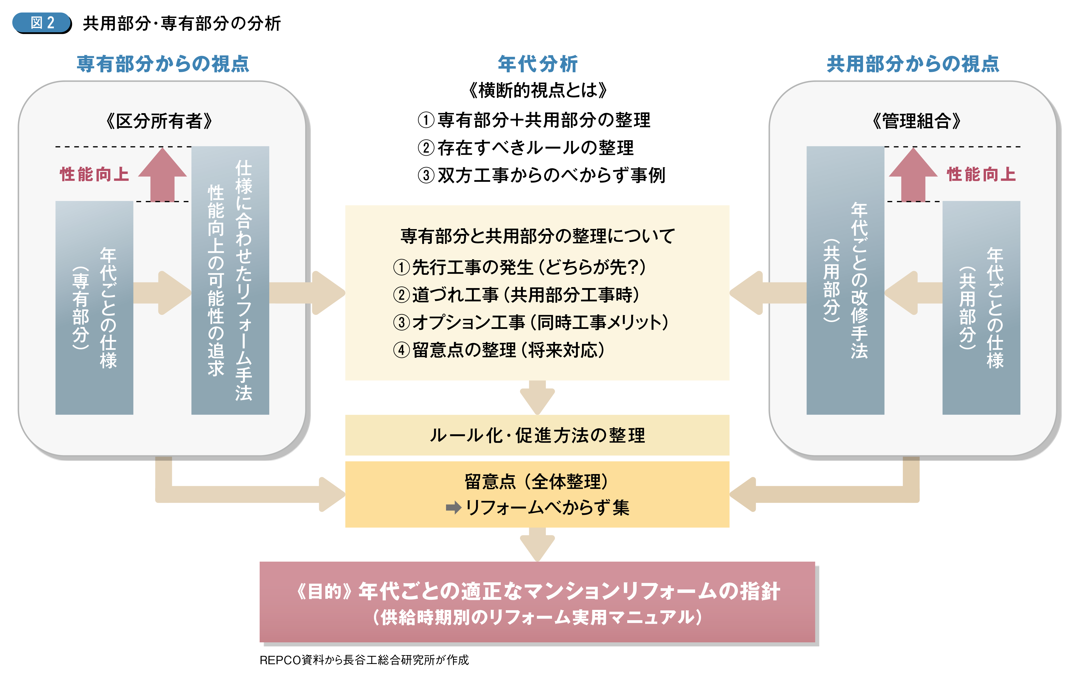 今回、供給時期別のハード(建築、設備等仕様)、ソフト(管理規約・細則等)と法令などを横断的に分析しながら、課題の整理を行いました。このような情報は、今後マンションリフォームに参入する業者の方や、共用部分・専有部分併せた建物全体として維持保全を行う管理会社の方々のニーズが高いと考えました。
