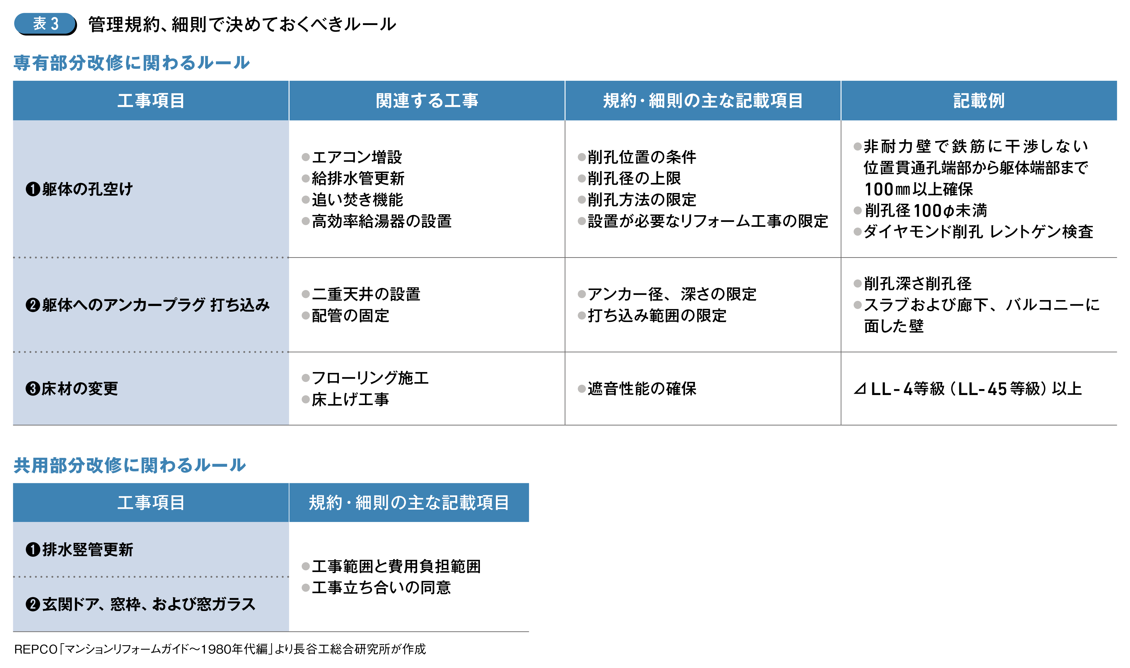 また、本ガイドには、現在のリフォームに対応していない管理規約等の改善を促す記述がある。「物理的劣化、機能的劣化を解消しない限り資産価値の向上は見込めない。品質の確保と資産価値向上を図るため、管理規約・細則で基準を明確にする必要がある」として、専有部分リフォームに関わるルールを示している。(表3)