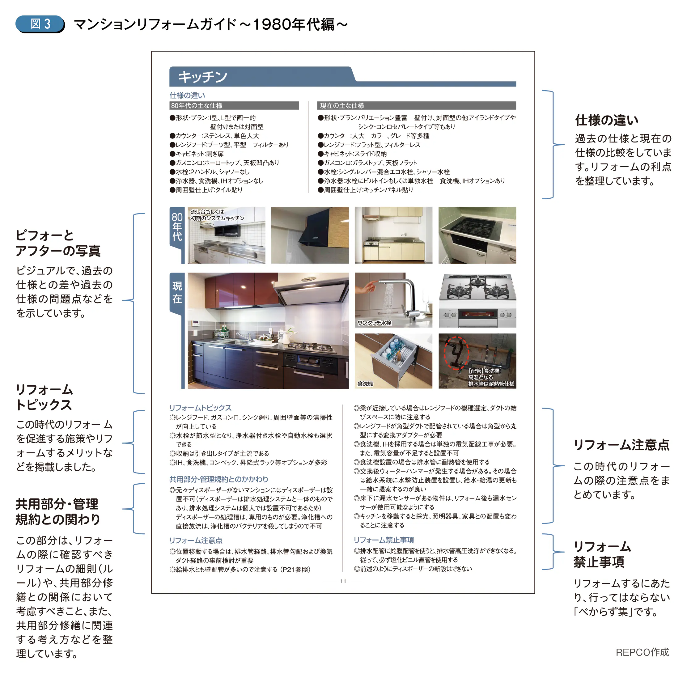内容としては図3に示すように各部位別にページを設け、実際の工事写真等を掲載し80年代と現在のマンションの仕様比較を行っている。また、「リフォームトピックス」としてリフォームを促進する施策、そのメリットの他、「リフォーム注意点」、「リフォーム禁止事項」、そして「共用部分・管理規約との関わり」等の項目を示し、会員企業向けに作成した。