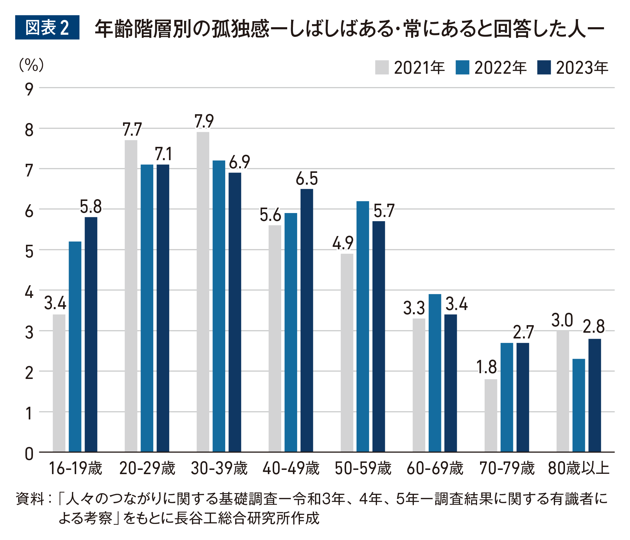 図表2は、孤独感が「しばしばある・常にある」と回答した人を年齢別に割合で確認した結果である。特に16ー19歳では、2021年と2023年を比較すると、孤独感を感じている人は約1.7倍に増加している。一方で、20ー29歳、30ー39歳の比較的若い世代では、孤独感を感じている比率はどの年齢層よりも高いが、2023年は2021年と比較すると減少している(図表2)。