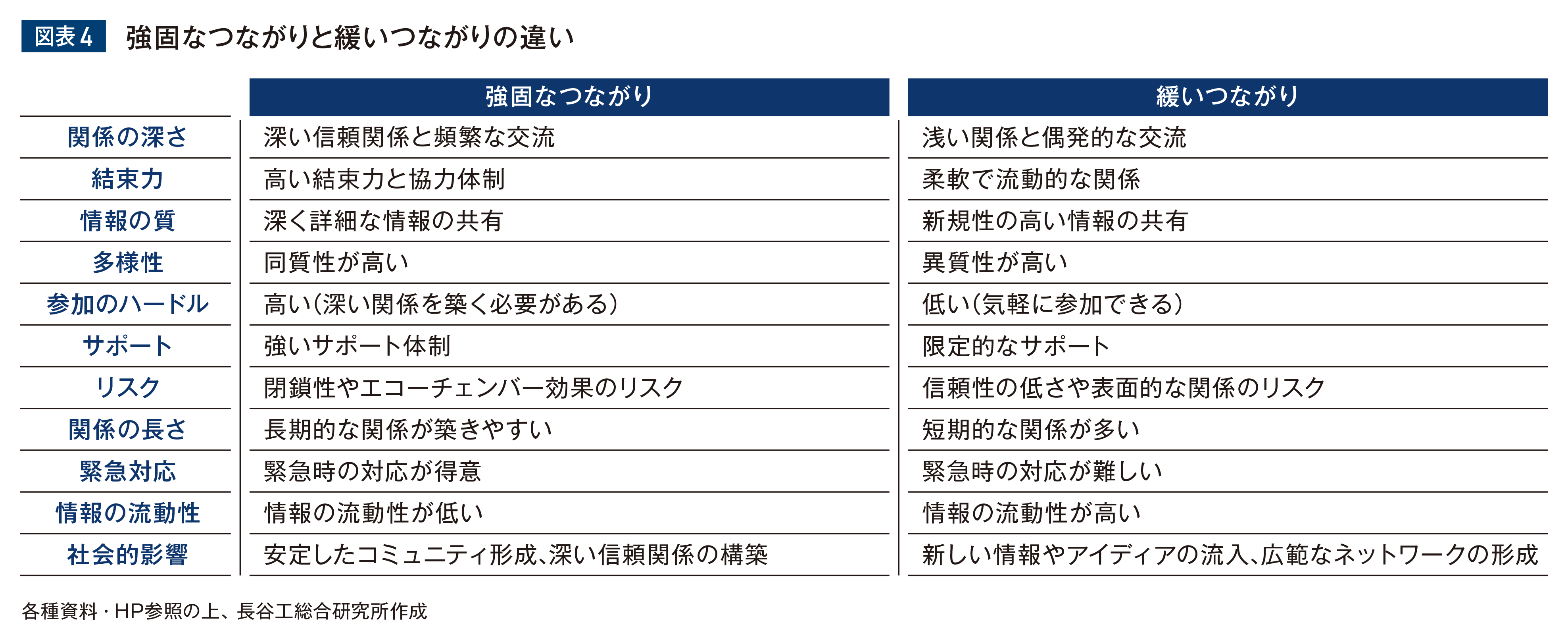 一方で、緩いつながりとは、基本的に個人をベースとした異なる集団間の異質な人びとの結びつきである場合が少なくない。