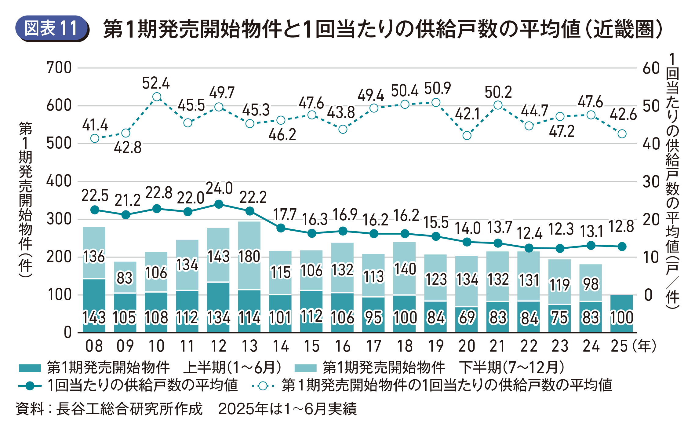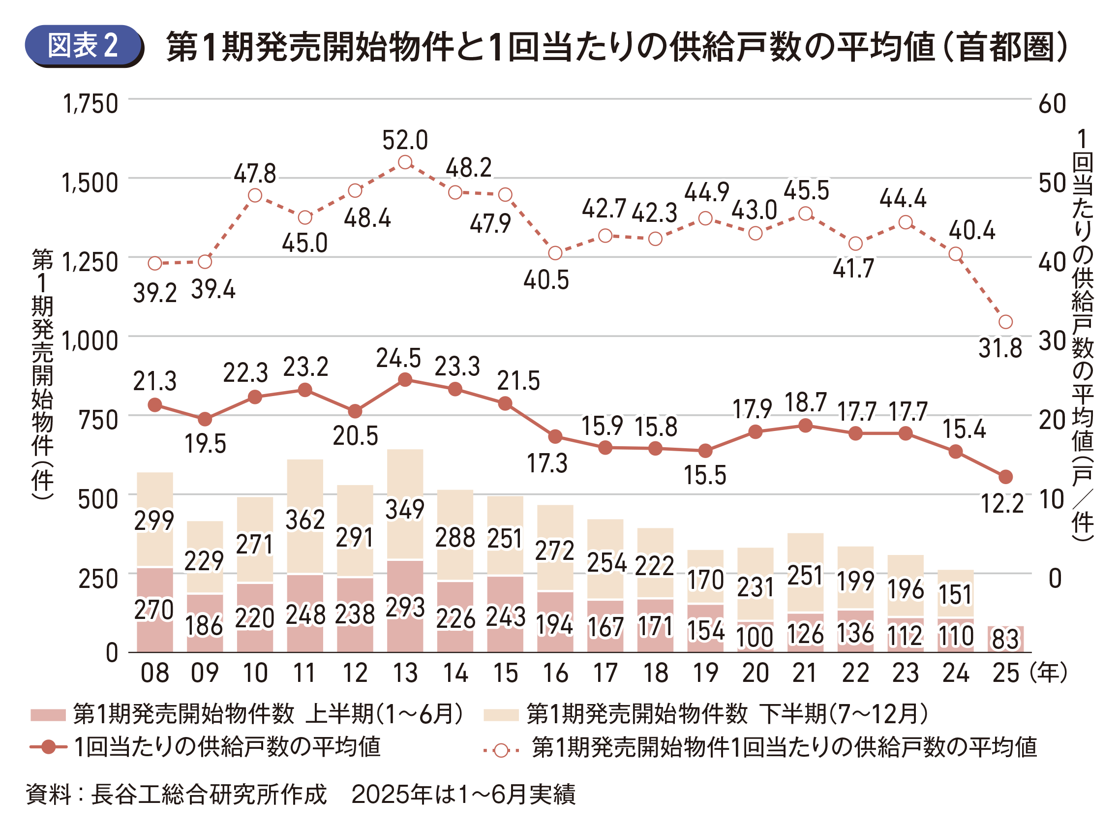 第1期発売開始物件は83件2,642戸、1回当たりの供給戸数の平均は31.8戸で前年同期(110件3,625戸、1回当たりの供給戸数33.0戸)と比較し供給件数24.5%減、供給戸数は27.1%減。第1期発売開始時ではまとまった戸数が供給される傾向にあるが、2025年上半期は第1期発売物件数の減少と共に、1回当たりの供給戸数も減少しており、全体の新規供給戸数減少の一因となっている(図表2)。