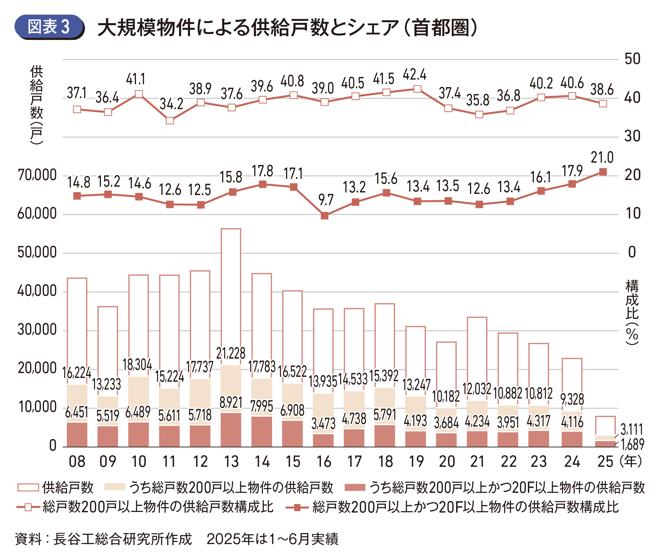 総戸数200戸以上の大規模物件の新規供給戸数は3,111戸、全体に占める構成比は38.6%で、前年同期(3,828戸、構成比42.2%)を戸数、構成比共に下回った。一方、総戸数200戸以上かつ20階以上の超高層物件は1,689戸で構成比21.0%と、前年同期(1,471戸、構成比16.2%)から供給戸数、構成比共に上回った(図表3)。