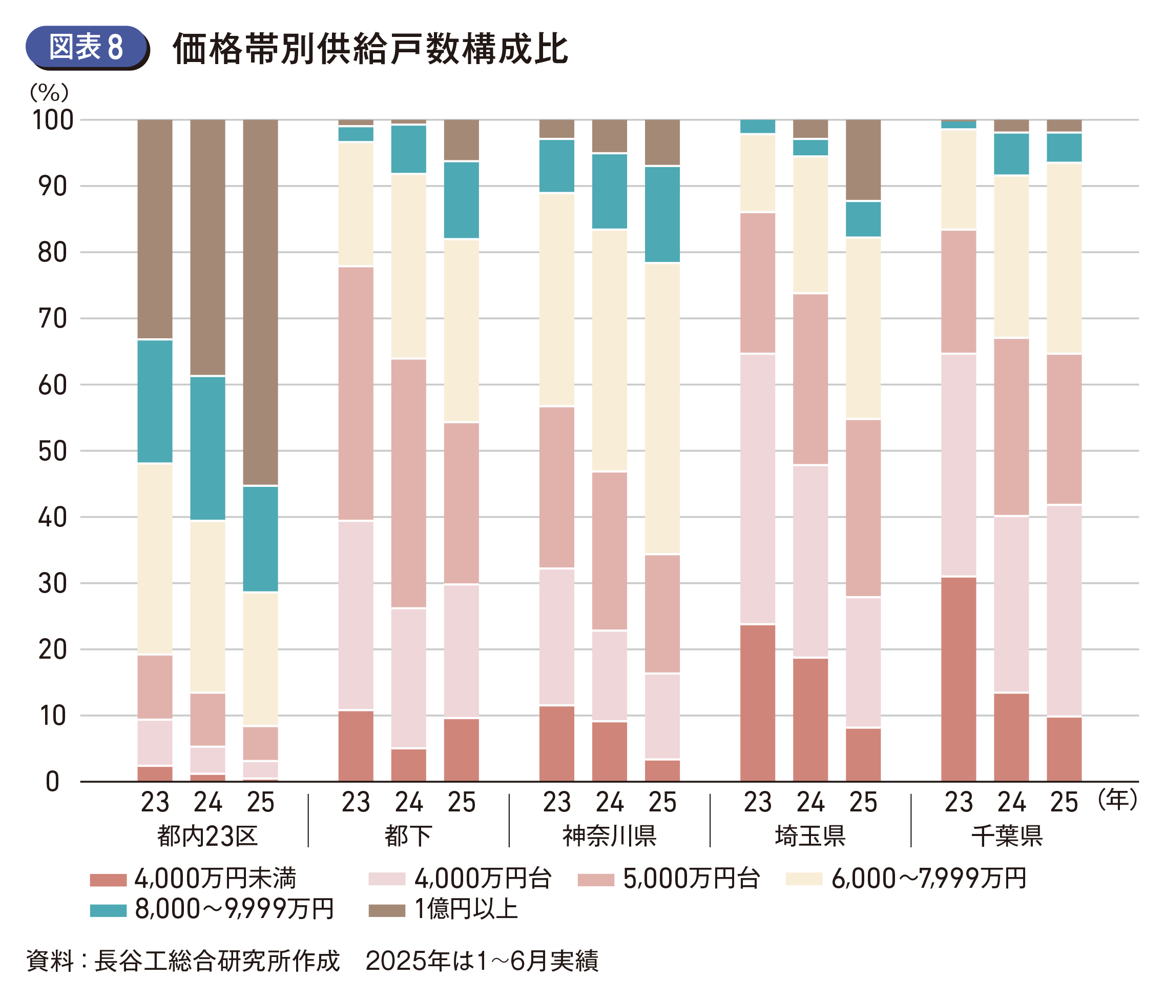 新規供給戸数を価格帯別に分類すると、都内23区は1億円以上、神奈川県は6,000万円以上の構成比が上昇した。都下、埼玉県、千葉県でも6,000万円以上価格帯の住戸構成比が上昇しているものの、5,000万円台までの住戸が依然として半数以上を占めている(図表8)。