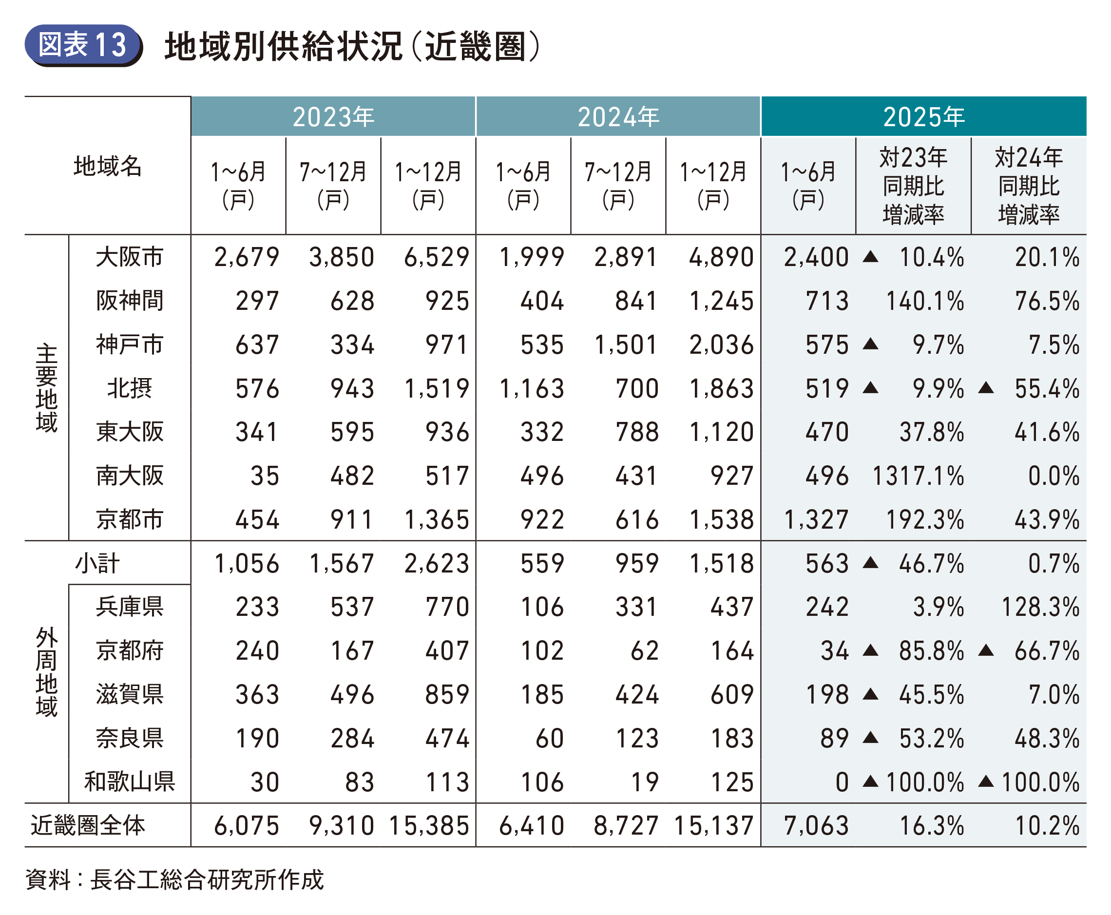 地域別供給状況をみると、主要地域においては、大阪市が前年同期比20.1%増の2,400戸で、北区(前年同期554戸→215戸)、天王寺区(同224戸→89戸)などで前年同期を下回ったものの、浪速区(同89戸→224戸)、東成区(同0戸→282戸)、住之江区(同26戸→128戸)などが寄与した(図表13)。