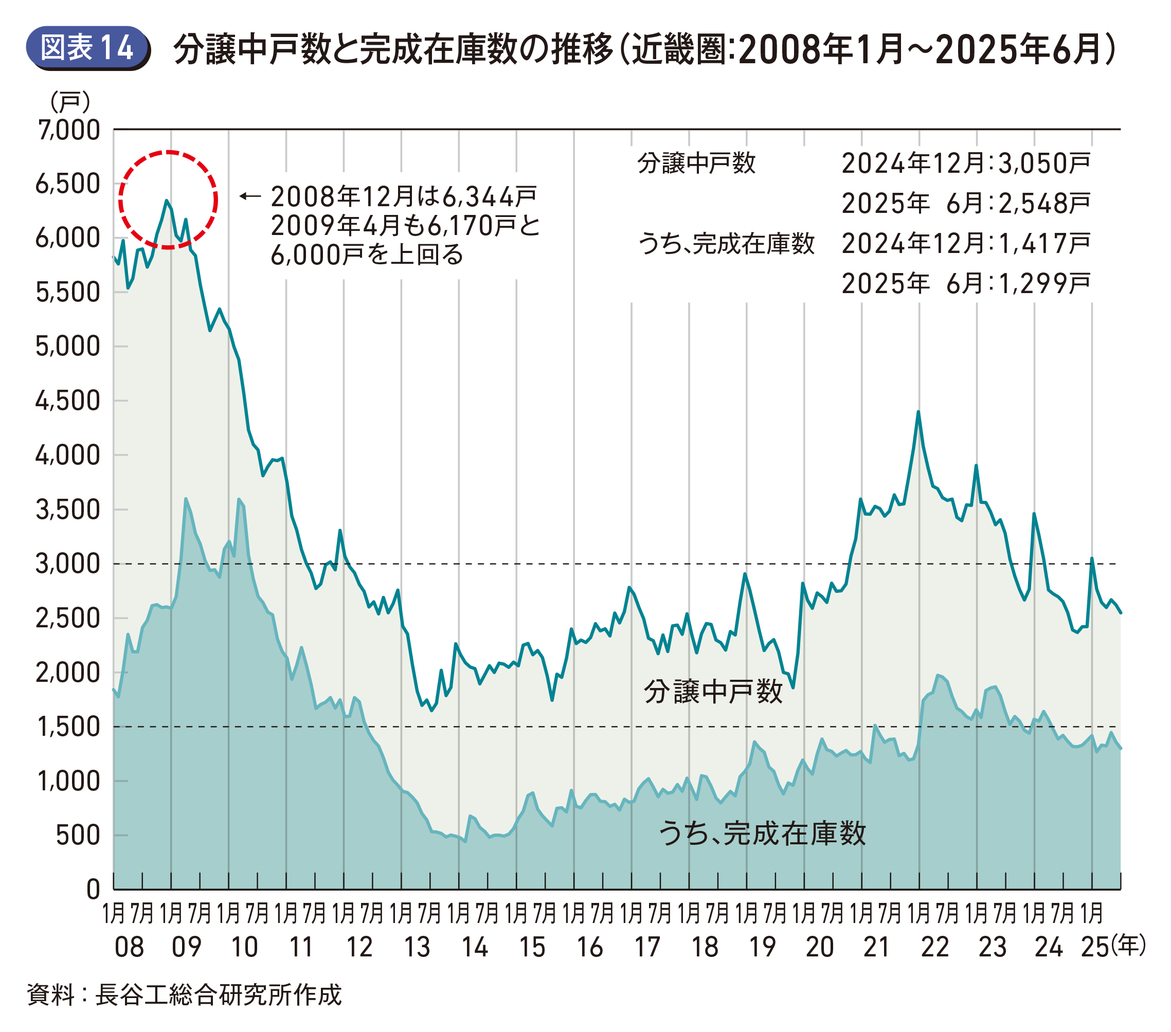 2025年6月末の分譲中戸数は2,548戸で、うち完成在庫は1,299戸。共に前年同月末(分譲中戸数2,651戸、完成在庫1,419戸)を下回る(図表14)。