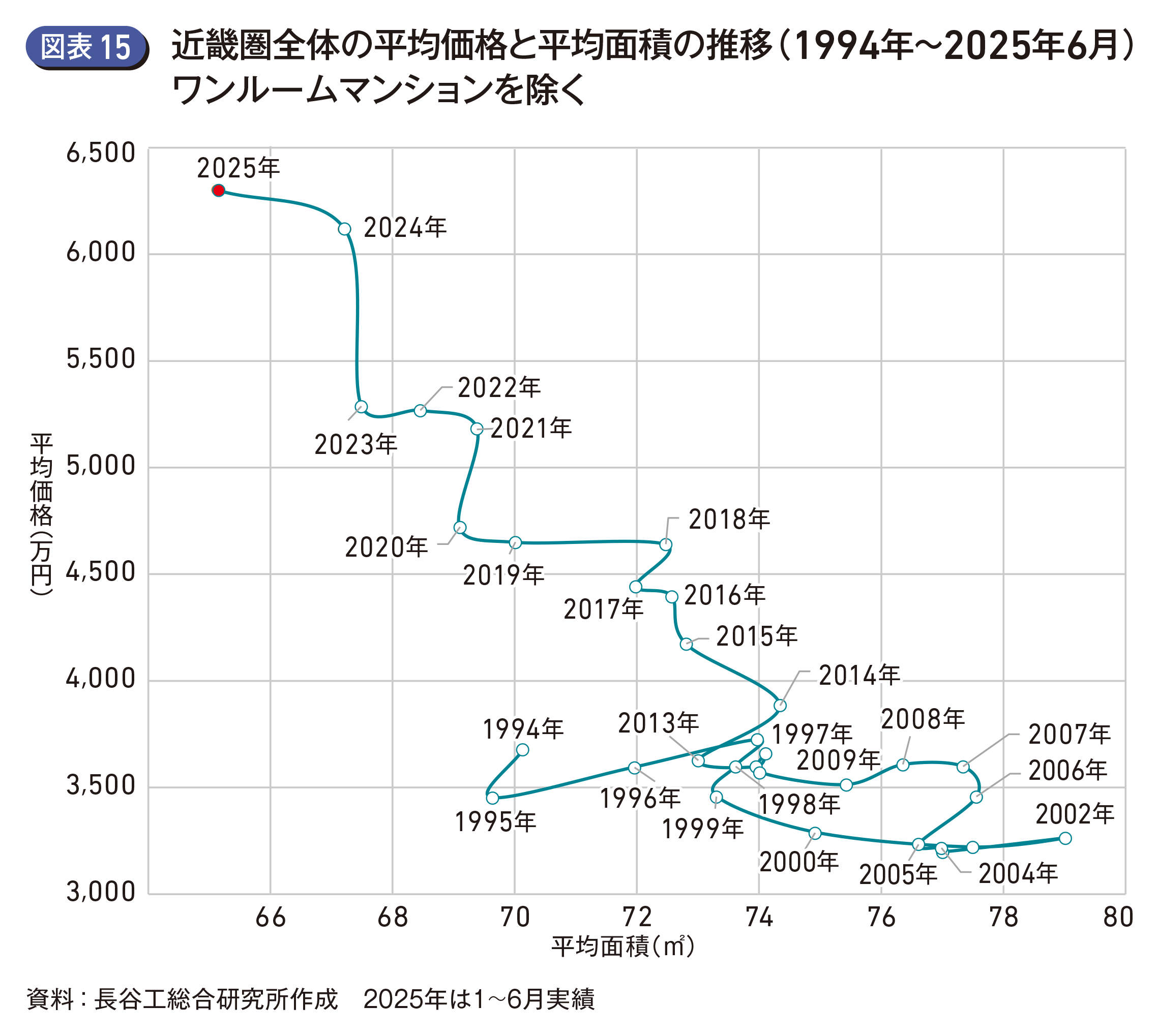 近畿圏全体の供給商品内容をみると、分譲単価は960千円/㎡で前年比1.9%アップしたが、ワンルームマンションの供給が復調し構成比が拡大したことで、平均面積は53.74㎡で同比12.9%ダウン、平均価格は5,158万円で同比11.3%ダウンした。ワンルームマンションを除くと、分譲単価は967千円/㎡(前年比6.4%アップ)と前年を上回った一方、平均面積は65.16㎡(同比3.1%ダウン)と縮小し、平均価格は6,299万円(同比3.0%アップ)となった。大阪市、神戸市、京都市では1DK・1LDKの構成比が増加(前年18.3%→23.4%)しており、コンパクトな間取りに対する需要が高まっている可能性も考えられる。