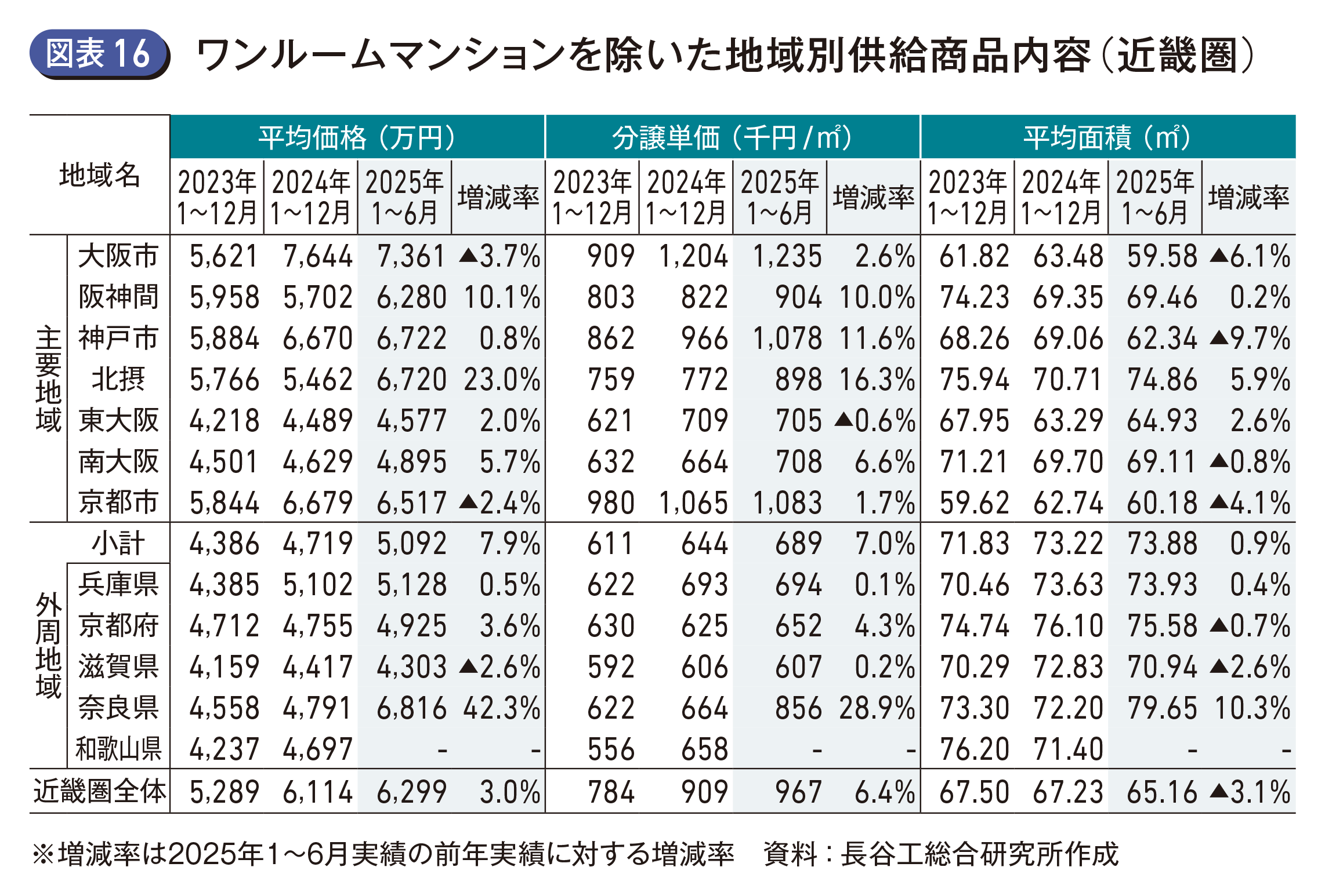 ワンルームマンションを除いた地域別供給商品内容をみると、大阪市では分譲単価は1,235千円/㎡(前年比2.6%アップ)、平均面積は59.58㎡(同比6.1%ダウン)、平均価格は7,361万円(同比3.7%ダウン)。再開発大規模物件の第1期発売が前年同期に続いて行われたこともあり、平均価格は7,000万円を超えた。