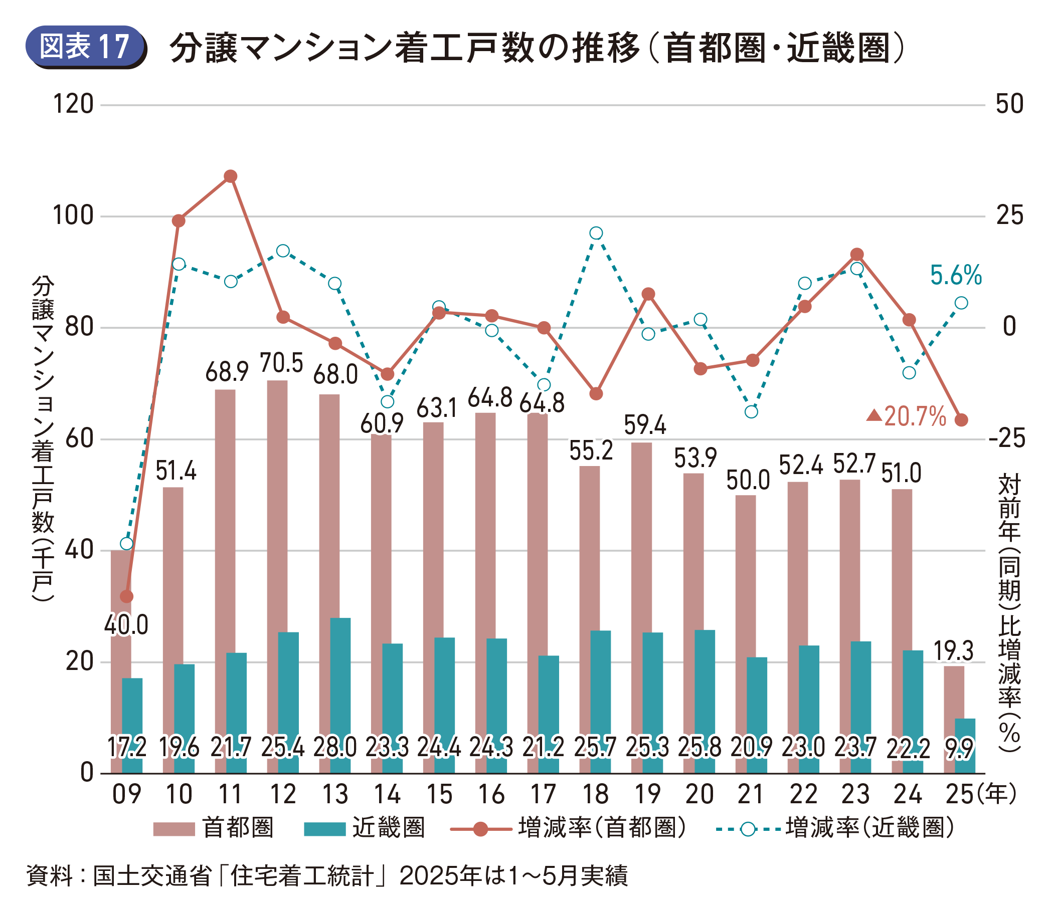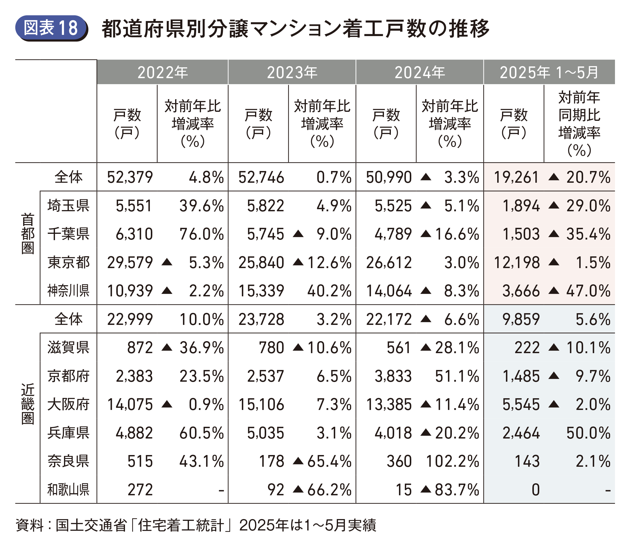 2025年1~5月の分譲マンション着工戸数は、首都圏で1万9,261戸、前年同期比20.7%減、近畿圏では9,859戸で同比5.6%増だった。