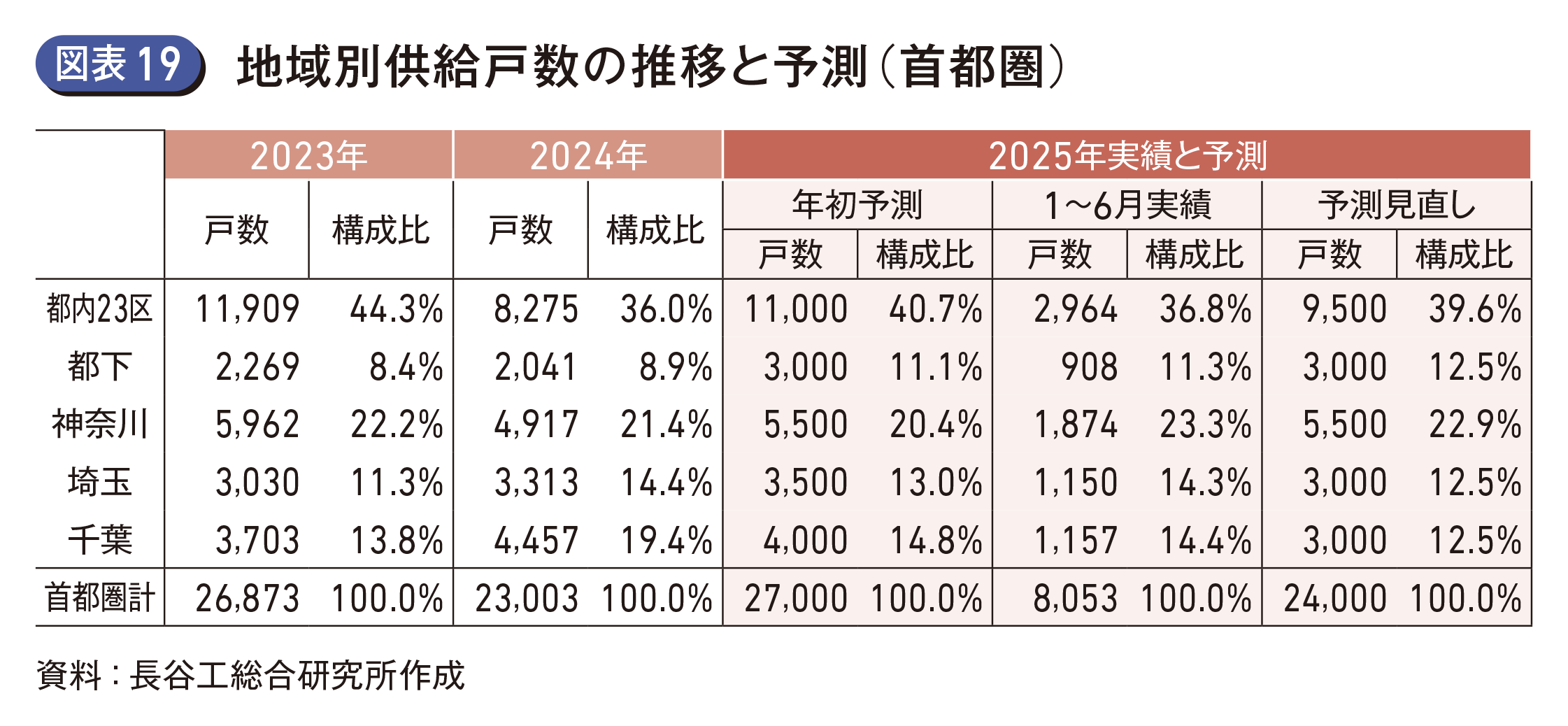 2025年下半期においては、2023年下半期(1万6,371戸)と同程度の供給が行われると判断した。2023年は上半期に都内23区山手エリアにおける大規模物件が複数発売開始されたが、下半期はその未供給住戸の供給に加え、夏~秋にかけて複数の大規模物件の第1期の発売が開始された。2025年下半期は供給動向や供給予定物件から下半期は2023年と似た状況となり、利便性の高い大規模物件により供給戸数が押し上げられると見込まれる。よって、下半期は1万6,000戸、年間では年初予測(2万7,000戸)から下方修正を行い2万4,000戸と予測した(図表19)。