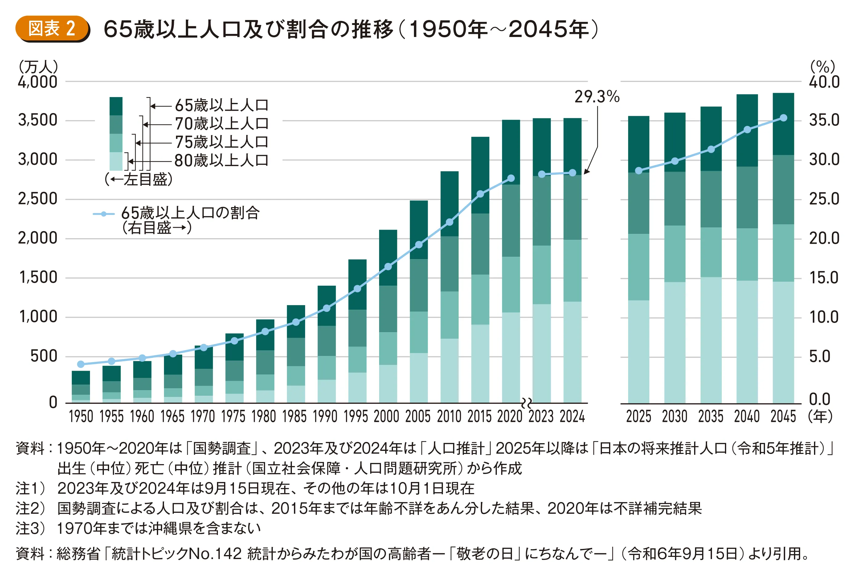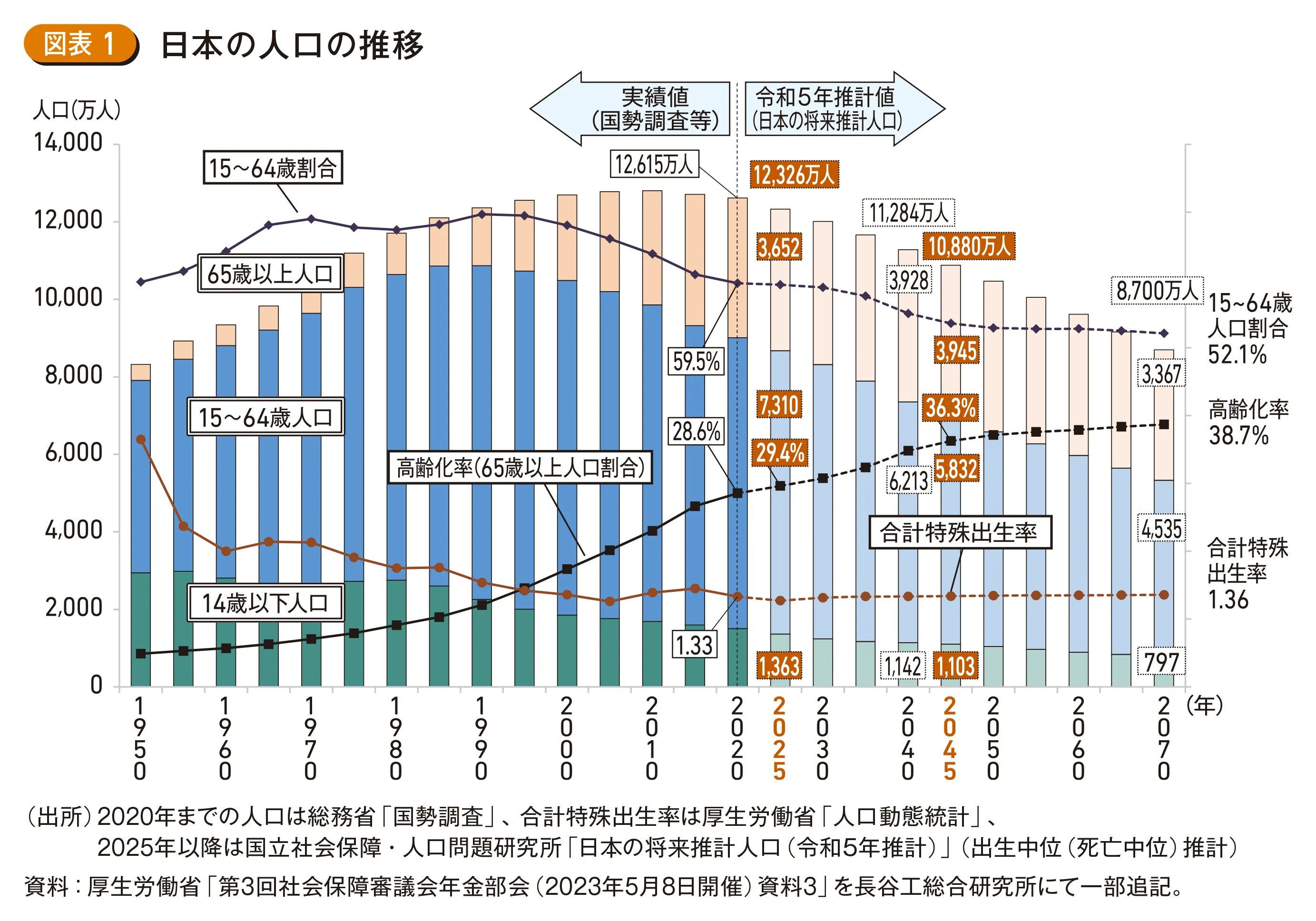 2040年代前半には、65歳以上人口がピークを迎える一方で、生産年齢人口はそれ以前から急減している。今後、加速度的に人口が減少する現実は避けられず、45年後の2070年の推定人口は、1950年頃と近い水準になるとされている。