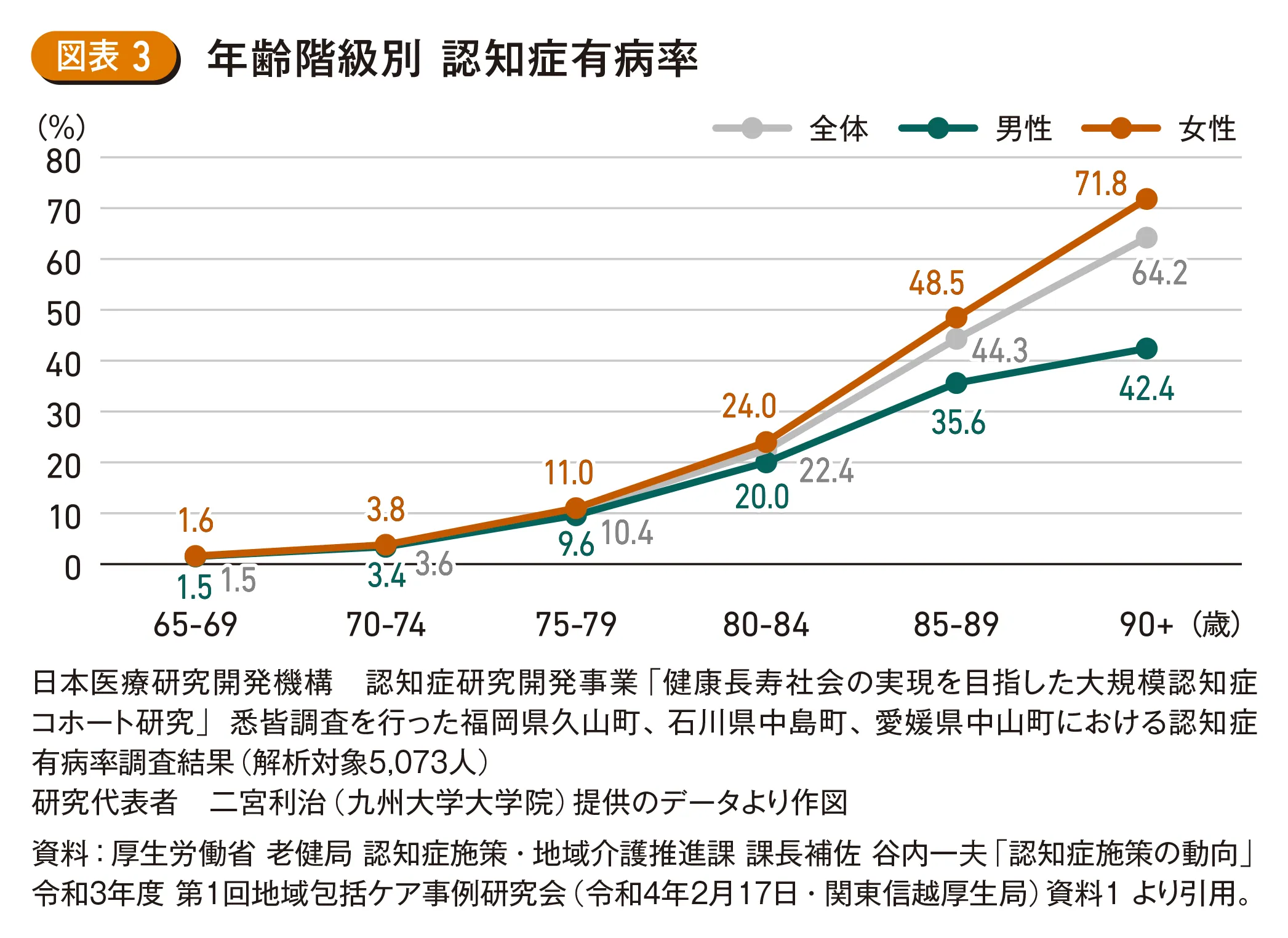 認知症の有病率は年齢とともに急激に上昇し、特に80代後半になると男女ともに増加傾向が顕著となり、90歳以上では男性でも約42%、女性に至っては70%を超えるとの結果が示されている。(図表3)