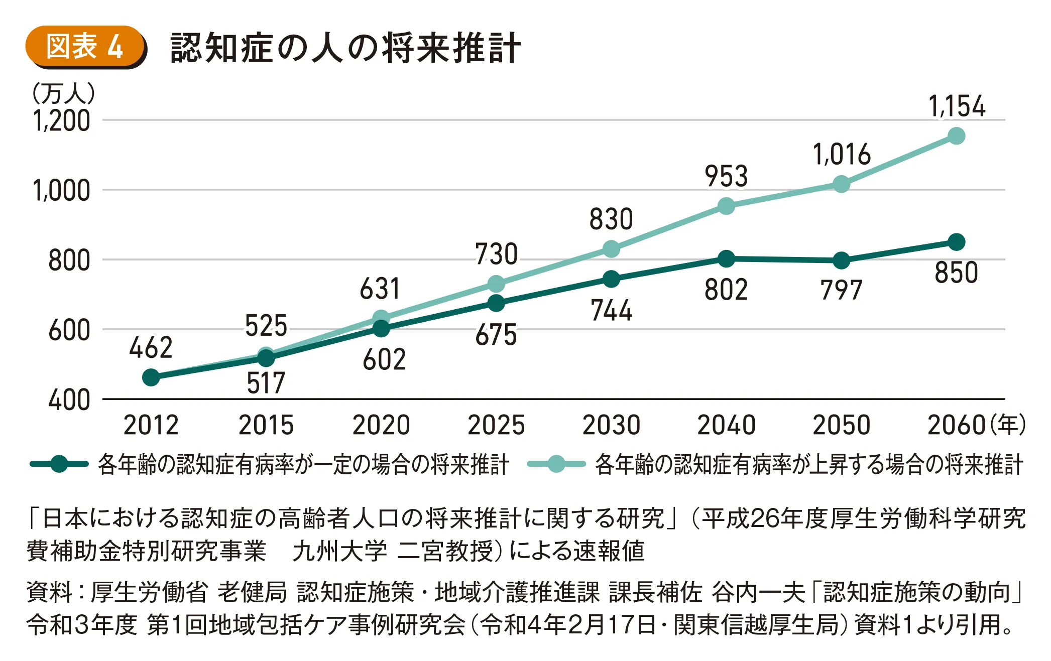 また、軽度認知障害(MCI)まで含めると、かなりの人数の推計値が示されており、他人事だと無視できる状況ではない。(図表4)