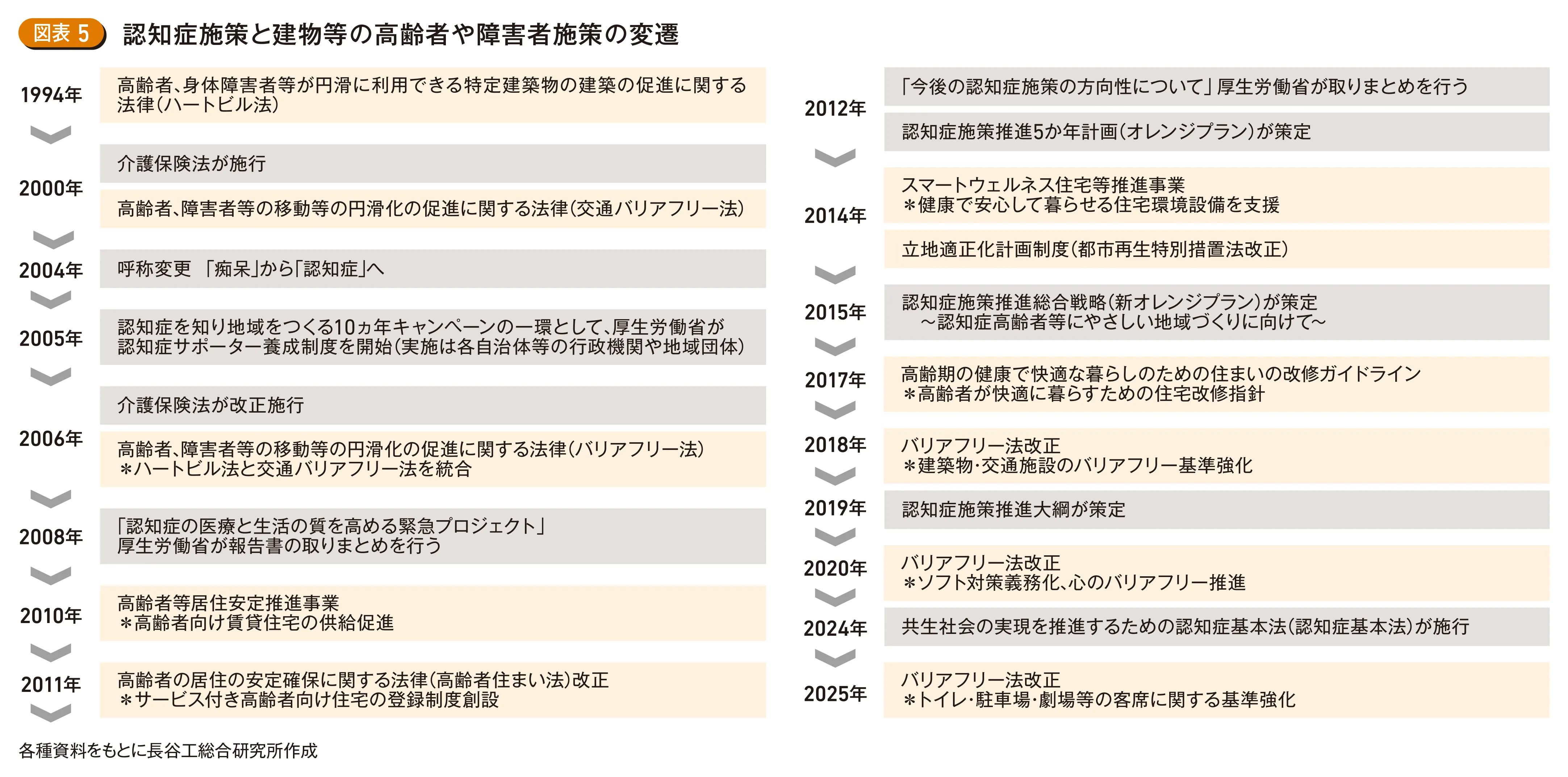 また、高齢者や障害者への建築物の配慮は、1994年のハートビル法に始まり、2006年のバリアフリー法で対象が拡大された。近年では認知症の人への配慮も進みつつあり、動線や表示、照明などに工夫が施されている。国は認知症対応住宅の整備や「心のバリアフリー*2」推進を通じて、誰もが安心して暮らせる環境づくりを進めている。(図表5)