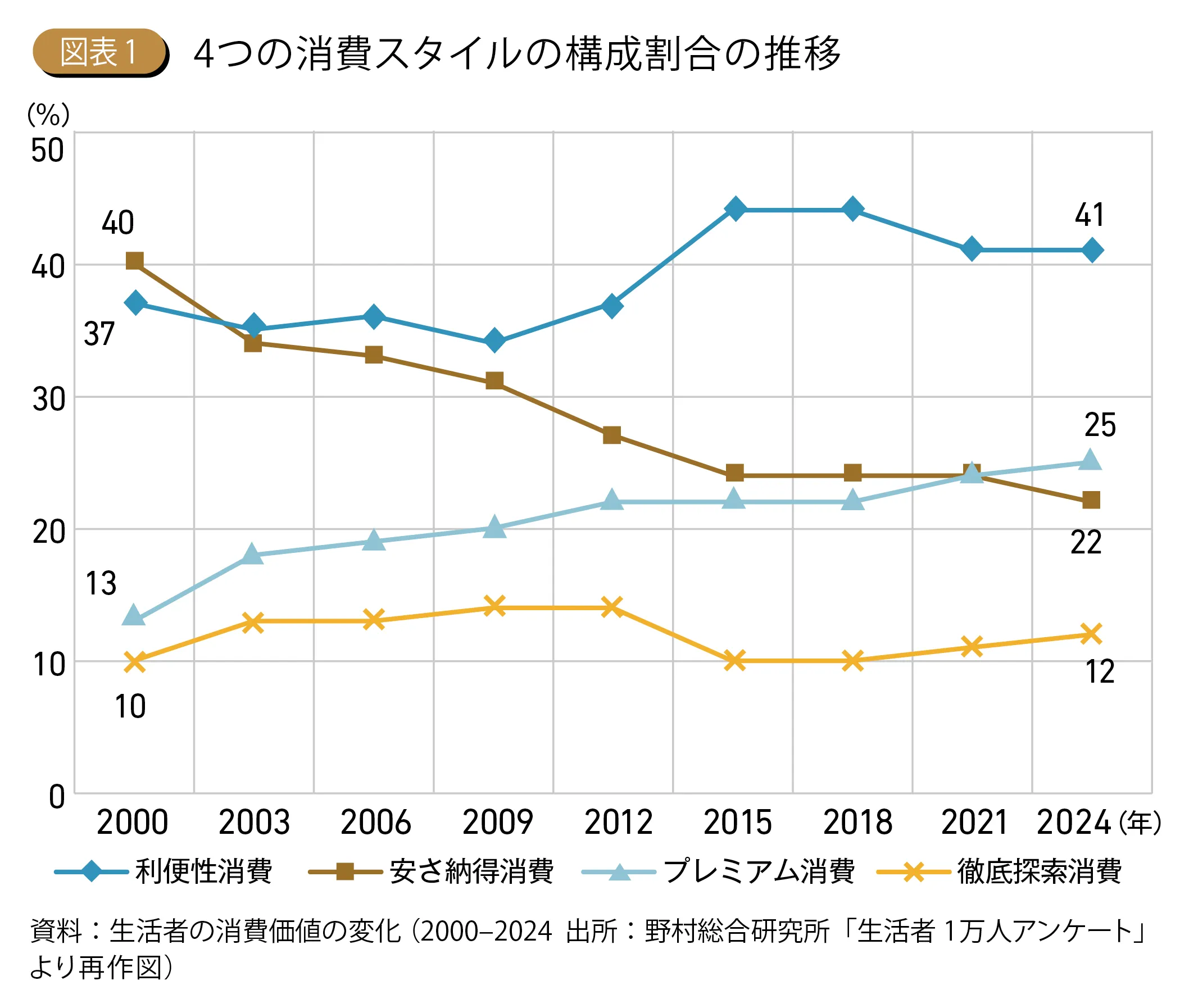 2000年では安さを重視した消費者行動が大きな割合を占めていたが、2024年では、約半分まで割合を減らしている。一方で人々は利便性とプレミアム感を求め、利便性と自分に合う消費者行動に変更してきたことが示されている。