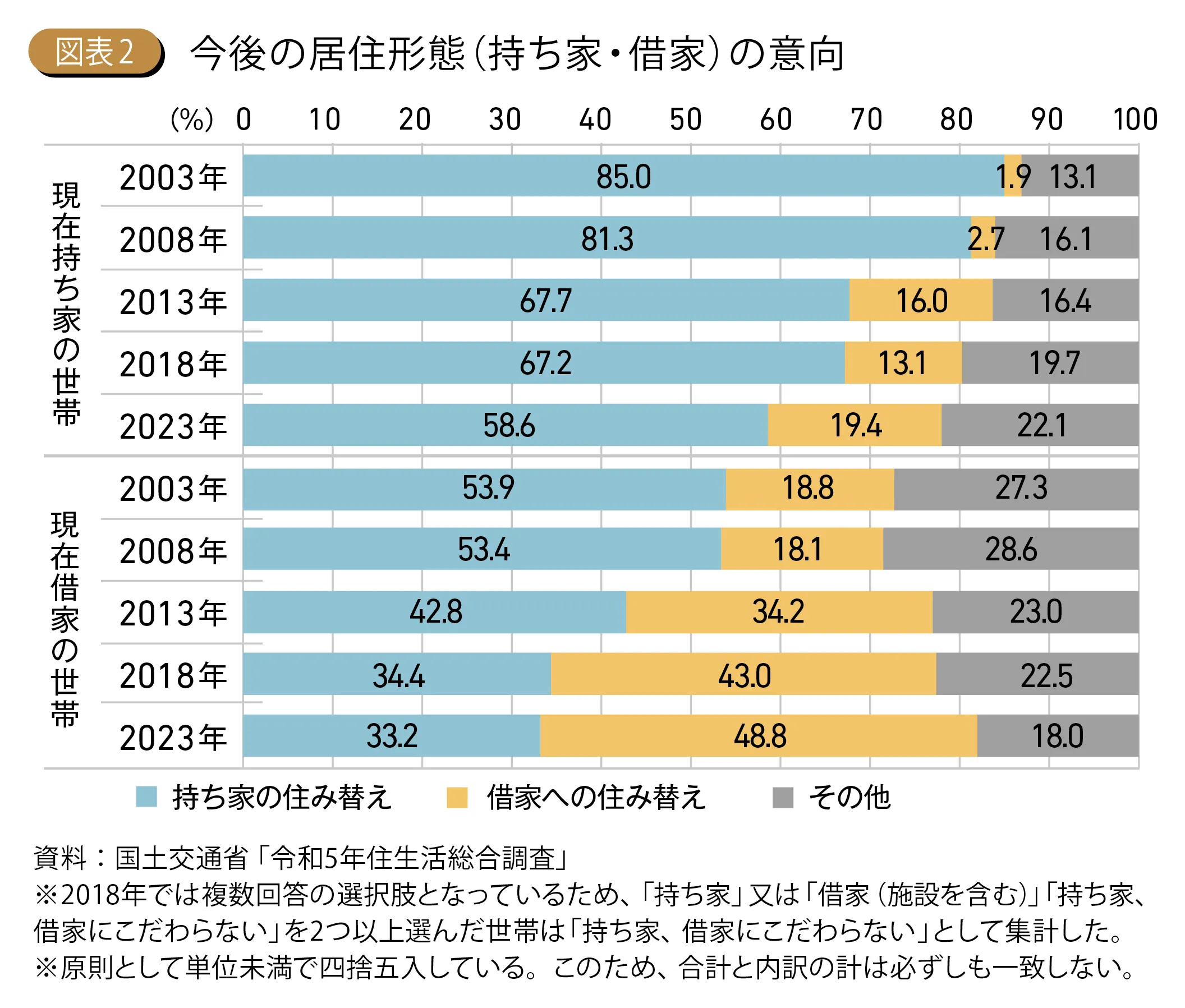 例えば「令和5年住生活総合調査」(図表2)で、現在の住まい(持ち家・借家)から今後の住み替え意向がある世帯では、「借家への住み替え」意向が過去最大になり、特に現在借家に住んでいる世帯では、ほぼ50%が次の住まいも借家への意向を示している。