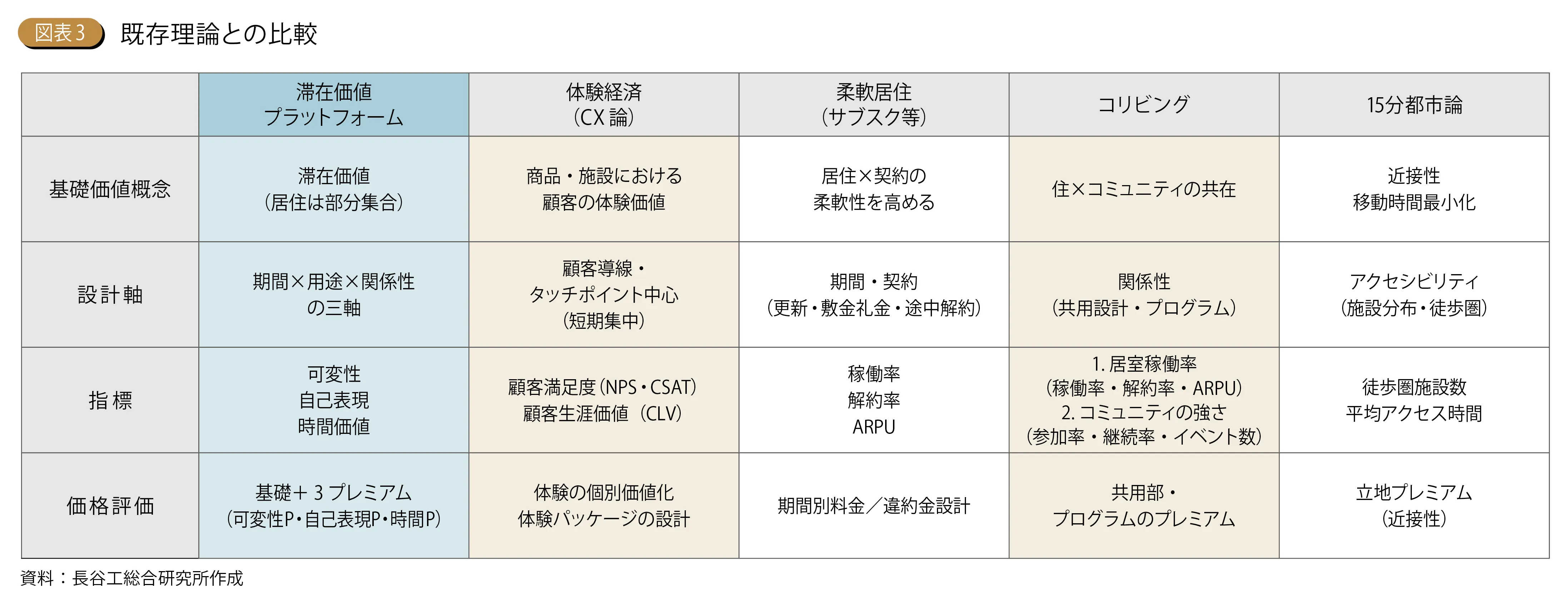 この観点に立てば、消費者が住まいに求める「箱の選択」から「自分に合う滞在」というニーズの変化に応え、人々に選択肢を提供するために、住宅=箱から滞在体験のプラットフォームへ――という視座 を一段上げる意識転換が必要なのである((図表3)にて既存理論との比較)。