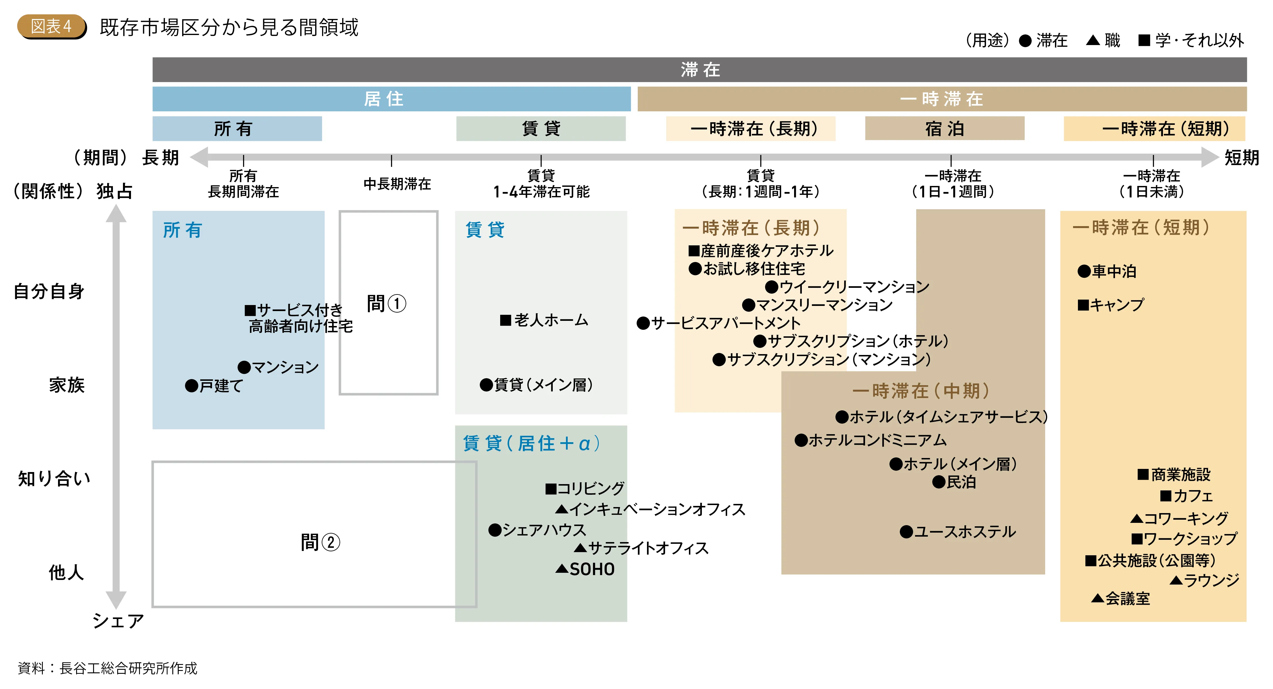 そこで本稿では、「滞在」を居住の上位概念に定義する。その結果、居住は滞在の一部という前提に立ち、滞在価値から生活空間を捉え直すことで、供給の硬直をほどき、居住の多様な選択肢を消費者に提供する可能性を広げることができる。