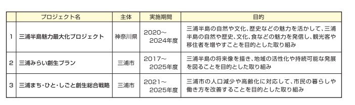 再生プロジェクト「三浦半島魅力最大化プロジェクト」と三浦市が主体である「三浦みらい創生プラン」「三浦まち・ひと・
