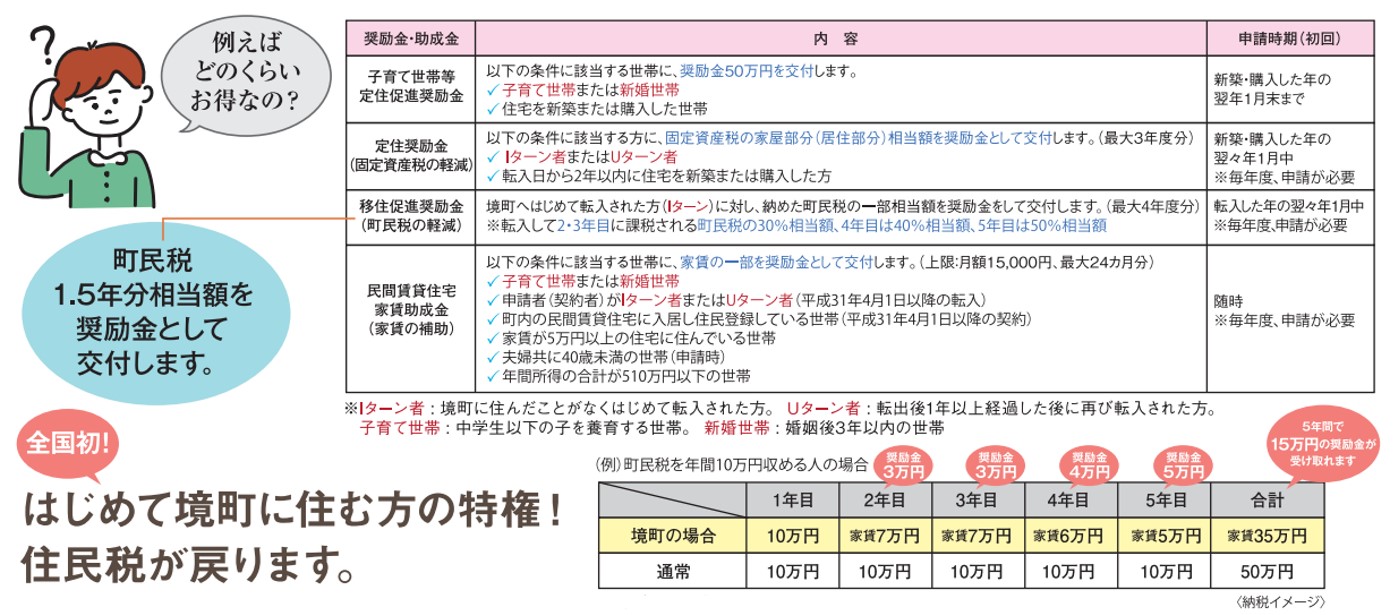 境町では①子育て・教育②住宅整備③移住・定住に対する奨励金、補助金サポートを3つの柱とし支援を行っており、