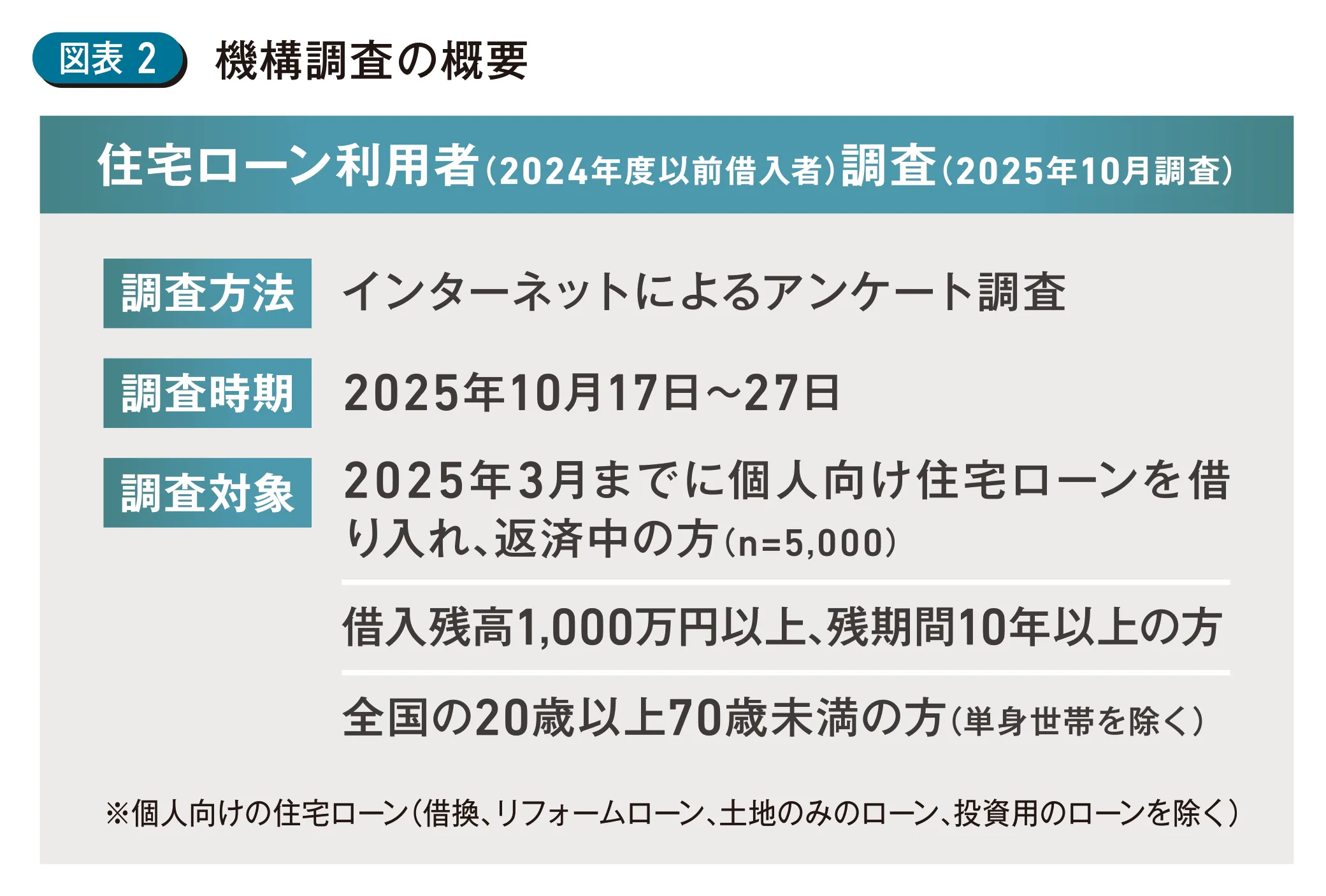 このような状況下において、日本の住宅ローン返済者はどのようなリスクを意識しているのであろうか。昨秋、住宅金融支援機構が住宅ローン返済を6ヵ月以上継続している方を対象に実施した「住宅ローン利用者(2024年度以前借入者)調査(2025年10月調査)」(以降「機構調査」という。)を基に考察したい(図表2)。