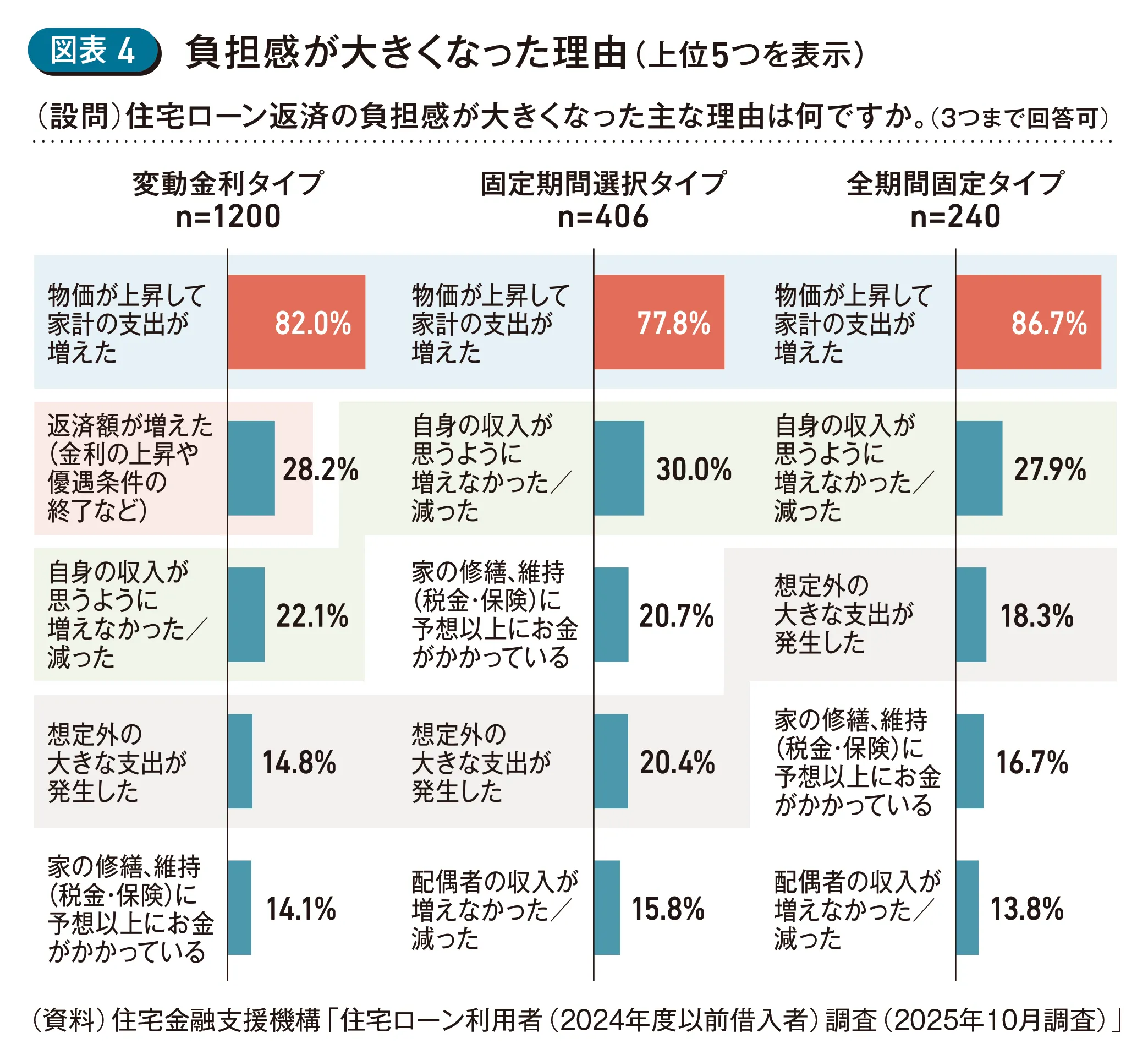 いずれの金利タイプにおいても「物価が上昇して家計の支出が増えた」が最多となった。変動金利タイプでは、「返済額が増えた(金利の上昇や優遇条件の終了など)」が2番目に多く、固定期間選択タイプと全期間固定タイプでは「自身の収入が思うように増えなかった/減った」が2番目に多い結果となった。また、「想定外の大きな支出が発生した」が、変動金利タイプ・固定期間選択タイプでは4番目、全期間固定タイプの3番目に多くなっている。