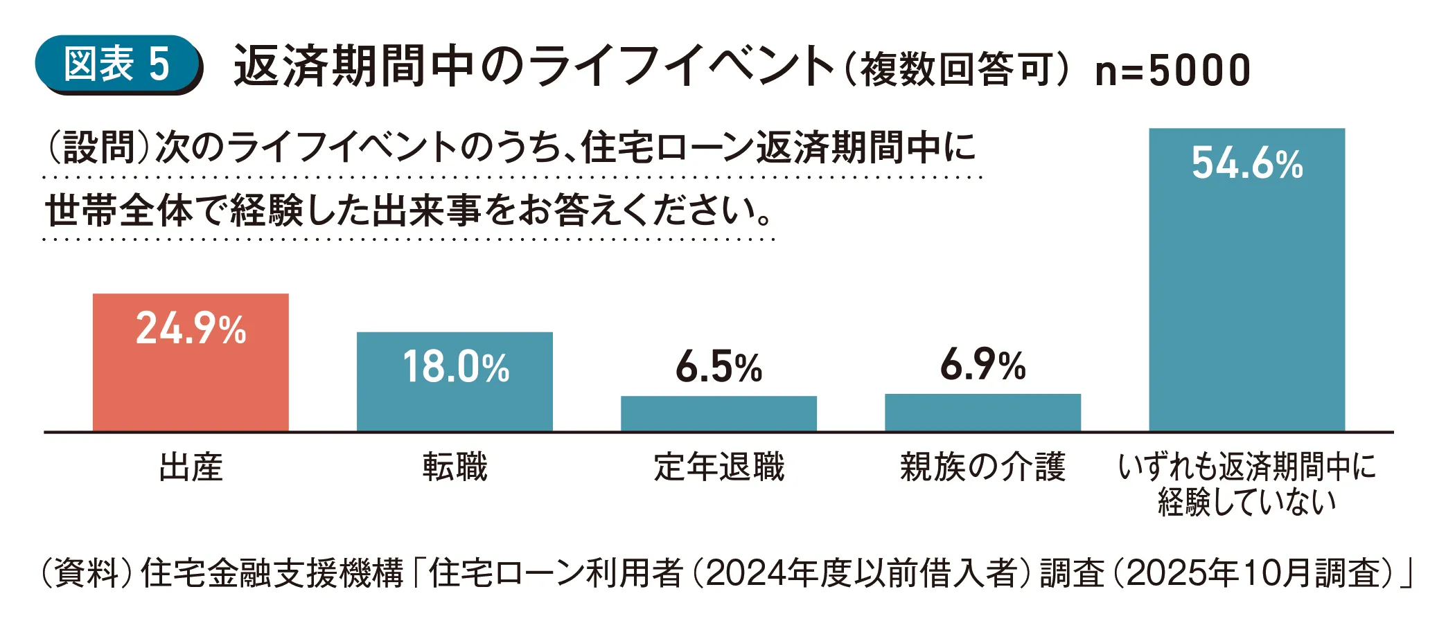 「自身の収入が思うように増えなかった」については「実質所得の減少」が影響しており、「自身の収入が減った」「想定外の大きな支出が発生した」については長期にわたる返済期間中のライフイベントが影響していると推測される。機構調査において返済期間中に経験した収入減・支出増を伴う可能性のあるライフイベントに関するデータをみてみると、約5割が出産、転職、定年退職、親族の介護のいずれかを経験している(図表5)。