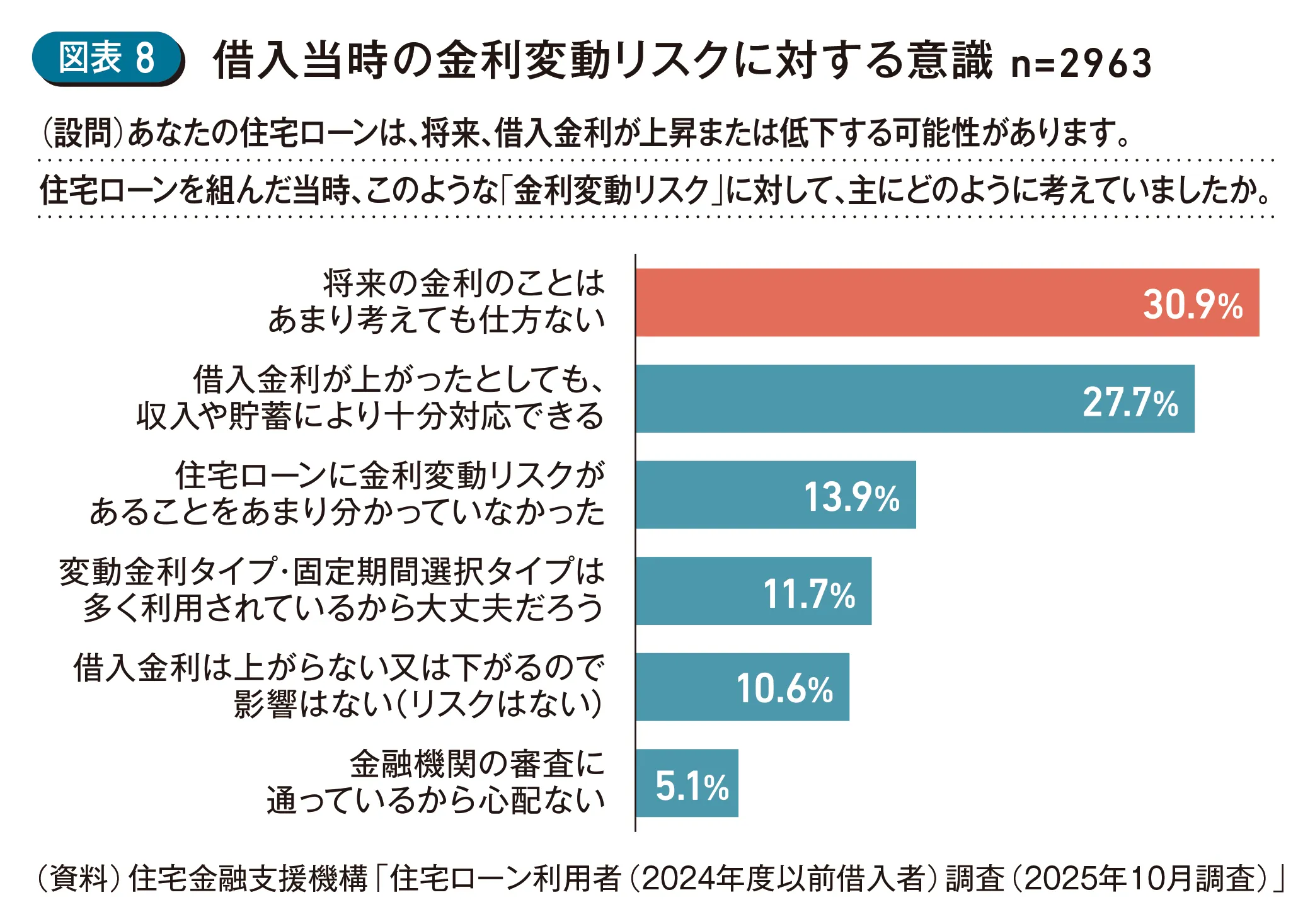 借入当時の金利変動リスクに対する意識についてみてみると、「借入金利が上がったとしても、収入や貯蓄により十分に対応できる」が27.7%を占める一方で、それ以外は「将来の金利のことはあまり考えても仕方ない」が30.9%、「住宅ローンに金利変動リスクがあることをあまり分かっていなかった」が13.9%など、実際に金利が上がった場合のことが意識されていなかった(図表8)。