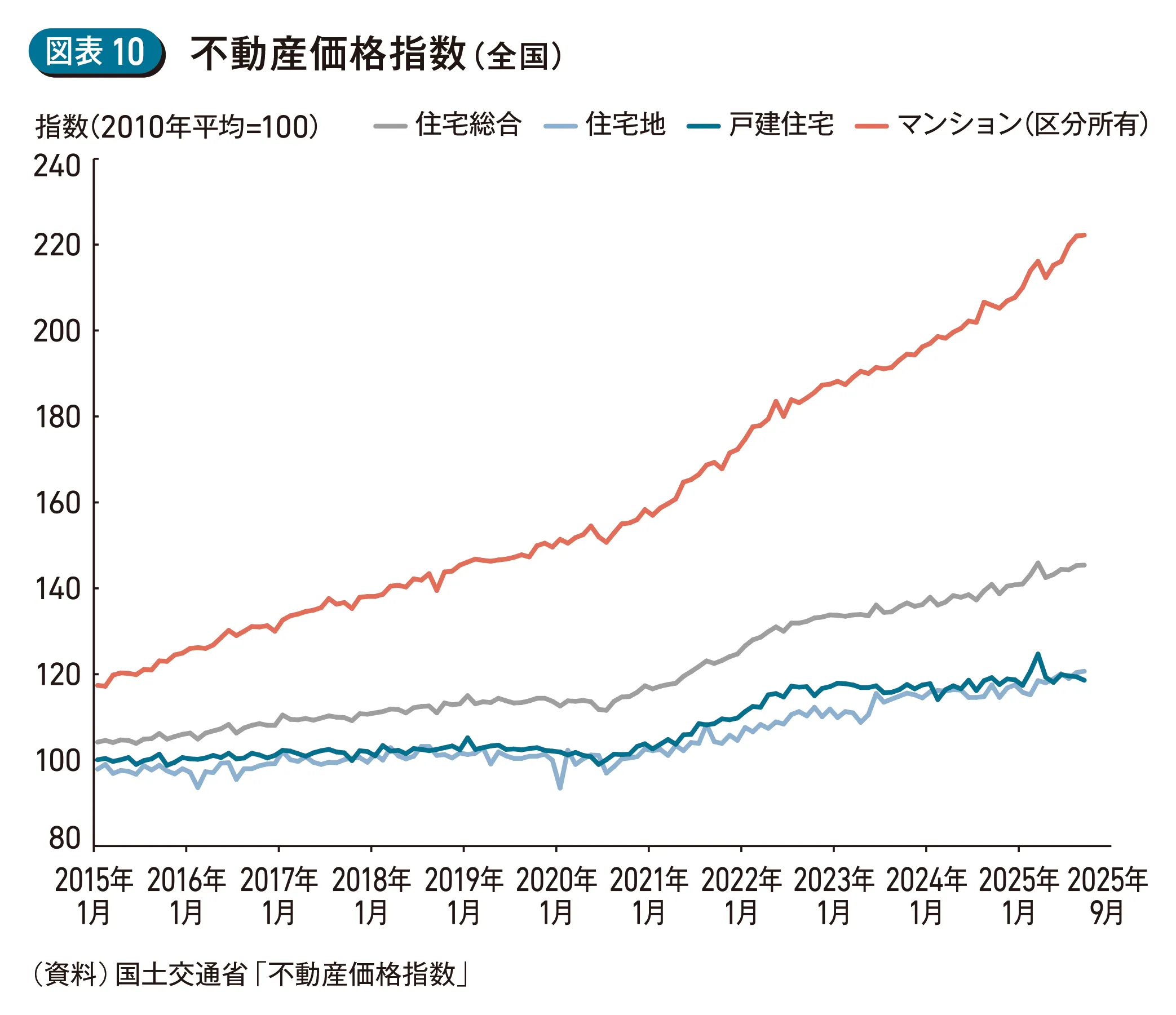 背景として、マンションを中心とした住宅価格の高騰が住宅ローンの借入額の増加を招いていることが挙げられる。国土交通省の「不動産価格指数」によると、マンション価格は2010年と比較して2倍の水準に達している(図表10)。