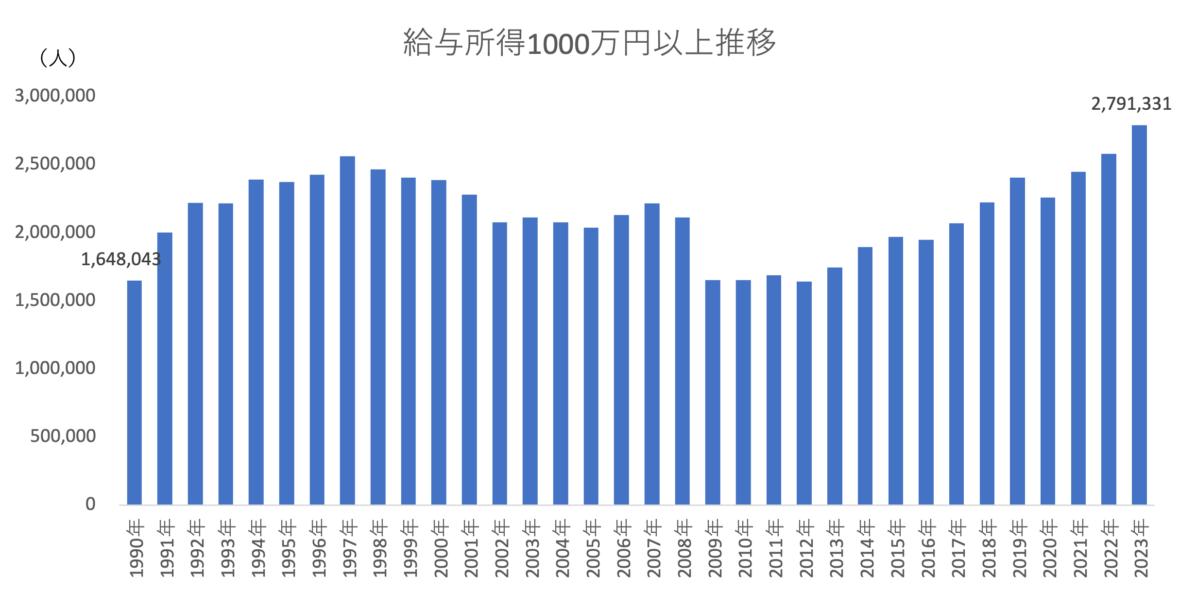 給与所得1000万円以上は年々増加しており、マンション価格が急騰した2022年から2023年の1年間だけでも約21万人(8%)増となり、底だった2012年の約164万人と比較すると約115万人という大幅な増加(70%)となっている。労働市場においても良好な傾向が続いており、春闘では昨年を上回る高水準の回答が続き、2024年の平均賃上げ率は34年ぶりの高水準を維持した。米国の政権交代により不透明感が拡大しているとは言え、所得環境は良好と言えよう。