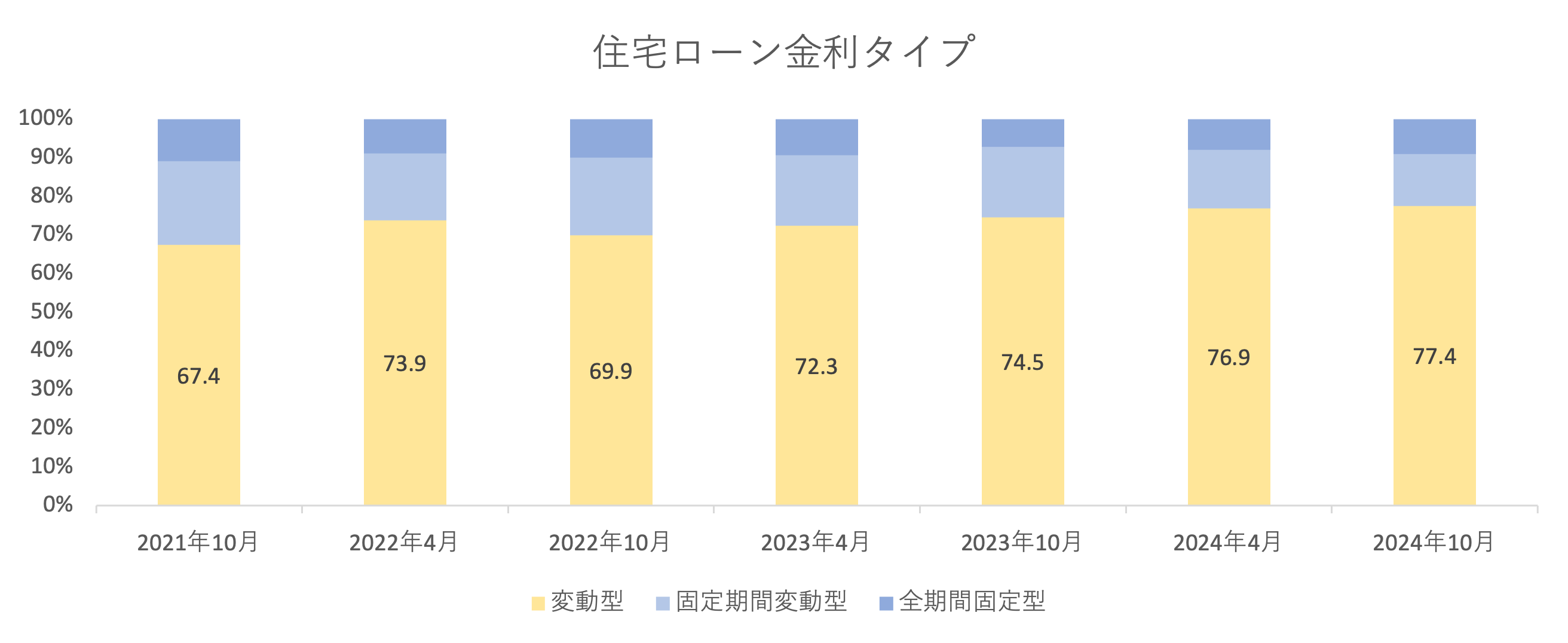 2025年4月に変動型住宅ローン金利が0.25%引き上げられ2.875%となった。これは2009年3月以来16年ぶりの水準。歴史的にみれば、低水準とは言え、購入者の約8割が変動型ローンを選択している現状を考慮すると、家計への影響は物価高騰と相まって無視できない。