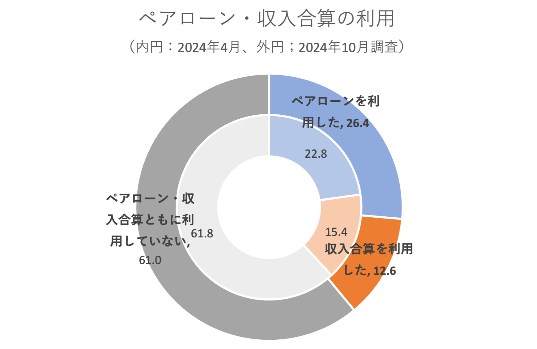 住宅金融支援機構の調査によると、「変動型住宅ローン」利用者は2021年10月以降、増加しており、2024年10が月には約8割が利用するようになった。また、価格高騰への対応策として、ペアローン・収入合算による購入も増加、更に借入期間の長期化も見られるようになった。都市部においては、就業の場も多く優良企業も多いことから、夫婦ペアローンを利用してより高額な借入、若しくは金利上昇リスクに対応することが可能であるが、地方圏においては、単独での所得が低く将来不安もあることから、必ずしも夫婦共働きがペアローン・収入合算に結び付いてはいないのが実情である。