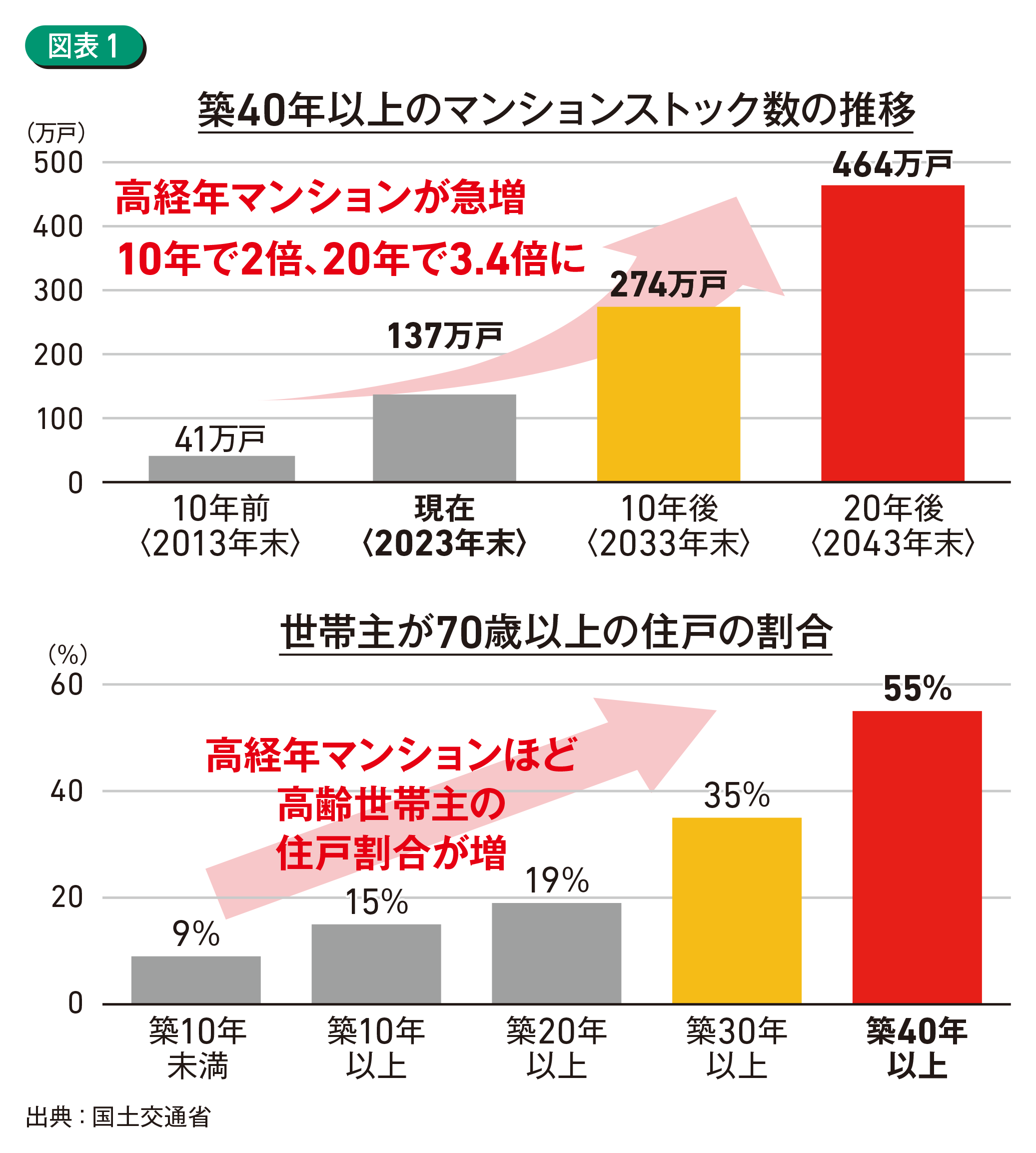 我が国におけるマンションは、国民の1割以上が居住する重要な居住形態の一つとなっていますが、一方で、築40年以上のマンションが全体の約2割を占めており、また、その住戸のうち、世帯主が70歳以上である割合も5割を超えるなど、建物と区分所有者のいわゆる「2つの老い」が進行しています(図表1)。