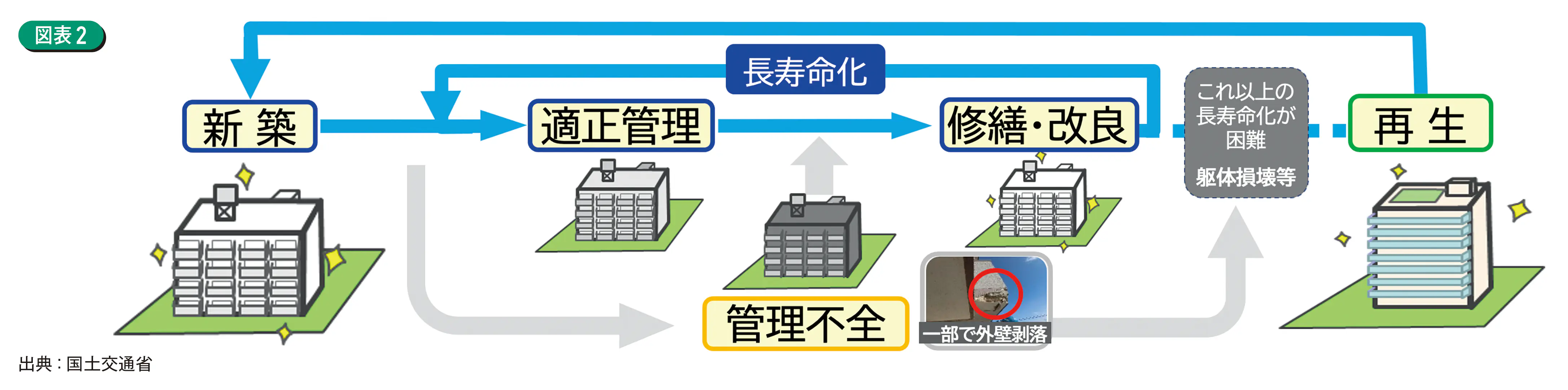 こうした状況から、外壁剥落の危険や集会決議の困難化などの課題が顕在化しており、これらに対処するためには、マンションの新築から再生までのライフサイクル全体を見通して、その管理・再生の円滑化等を図ることが必要です(図表2)。