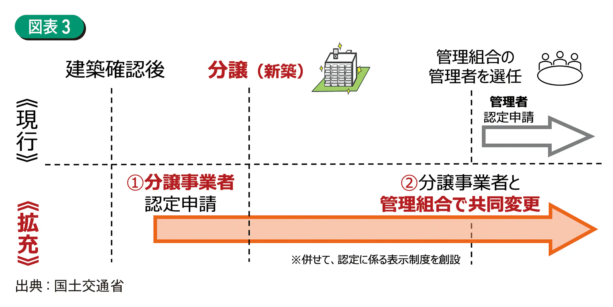 マンションにおいて、修繕積立金を積み立て、大規模修繕工事を適切に実施するなど、管理組合によるマンションの適正な管理を促すため、令和4年4月から管理計画認定制度を開始しているところですが、さらに、マンションの長寿命化を図っていく上では、新築の段階から適切な修繕計画等を策定し、その内容を区分所有者によく理解いただき、適切な管理につなげていくことが重要です。このため、新築時から適切な管理などが行われるよう、本改正法では、マンションの新築当初に区分所有権を有することとなる分譲事業者(不動産デベロッパー)が、管理組合の管理者等への管理の適正かつ円滑な引継ぎに関する事項等を記載した管理計画を作成し、都道府県知事等に対して認定の申請をすることができる等の規定を設けることといたしました(マンションの管理の適正化の推進に関する法律(以下「マンション管理法」)第5条の15、第5条の16、第5条の20等)(図表3)。