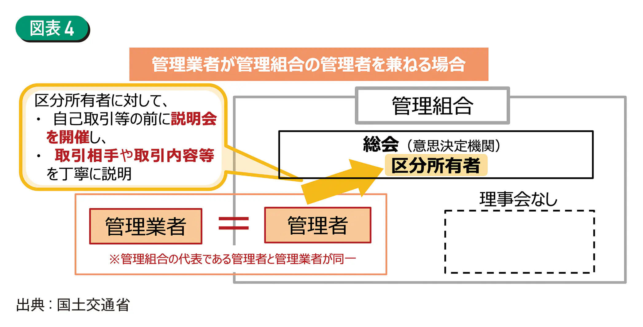 また、近年、区分所有者の高齢化等による管理組合役員の担い手不足を背景に、マンション管理業者が、管理事務を受託しているマンションの管理組合の管理者を兼ねるケースが出てきています。こうしたケースでは、マンション管理業者が工事等の受注者・発注者の双方の立場に立つこととなり、いわゆる利益相反の懸念があることから、本改正法では、管理組合の管理者を兼ねるマンション管理業者は、自己等と取引を行うときは、予め説明会を開催し、区分所有者に対して必要な事項を説明しなければならない等の規定を設けることといたしました(マンション管理法第77条の2等)(図表4)。