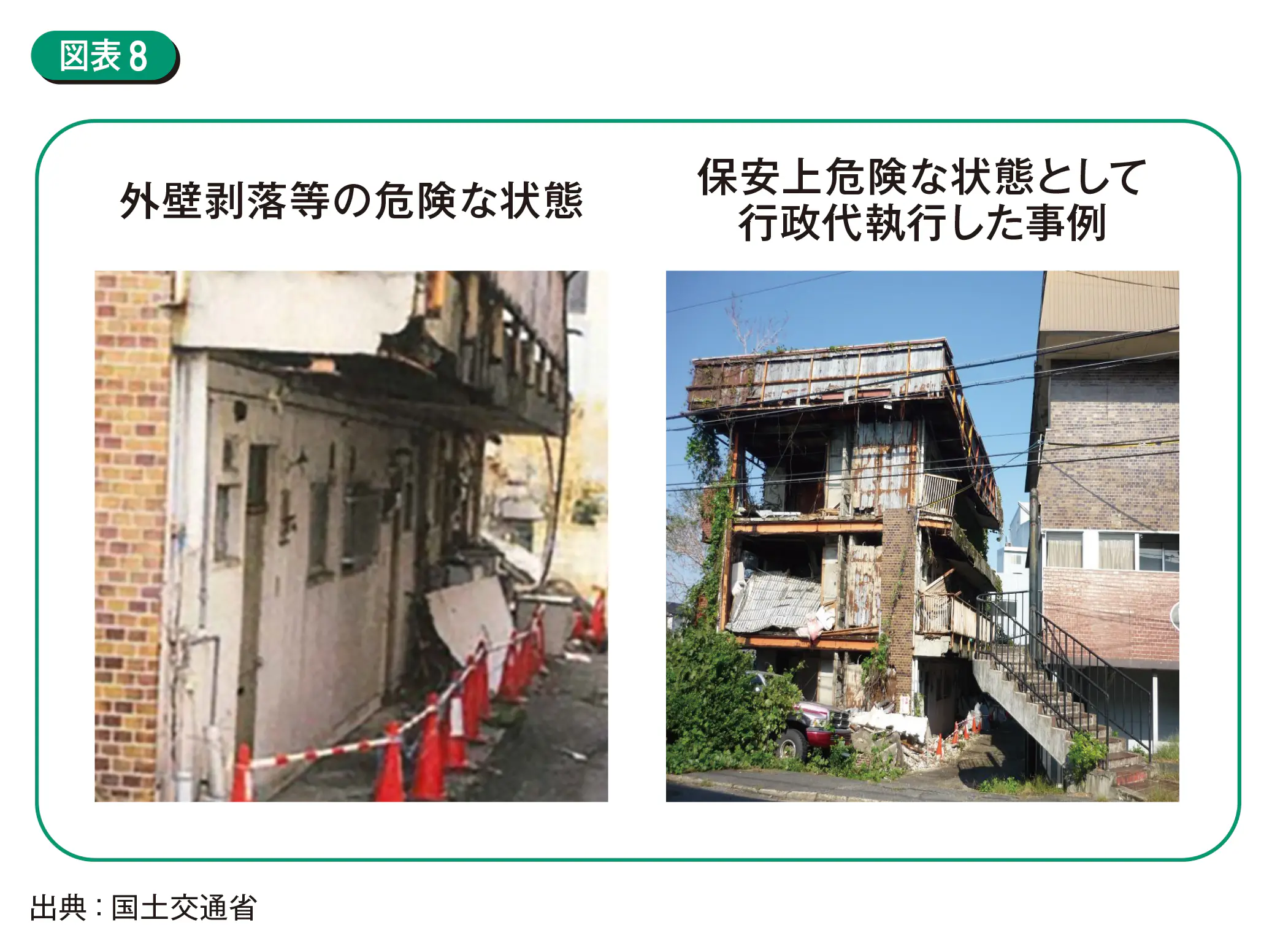 長期にわたって修繕等が適切に行われておらず、マンションの外壁にひび割れや剥落等が生じている場合、近隣住民をはじめ周辺に危険が生じるおそれが高いことから、こうした危険な状態にあるマンションに対して、管理組合の自主的な対応を待つだけではなく、地方公共団体からの能動的な働きかけが行いやすくなるような制度的な措置を求める要望を多数いただいておりました。このため、本改正法では、こうした保安上危険なマンション等に対し、地方公共団体が報告徴収、助言指導・勧告、専門家のあっせん等を行うことができる制度を創設することといたしました(マンション管理法第5条の2、マンション再生法第4条の2)(図表8)。