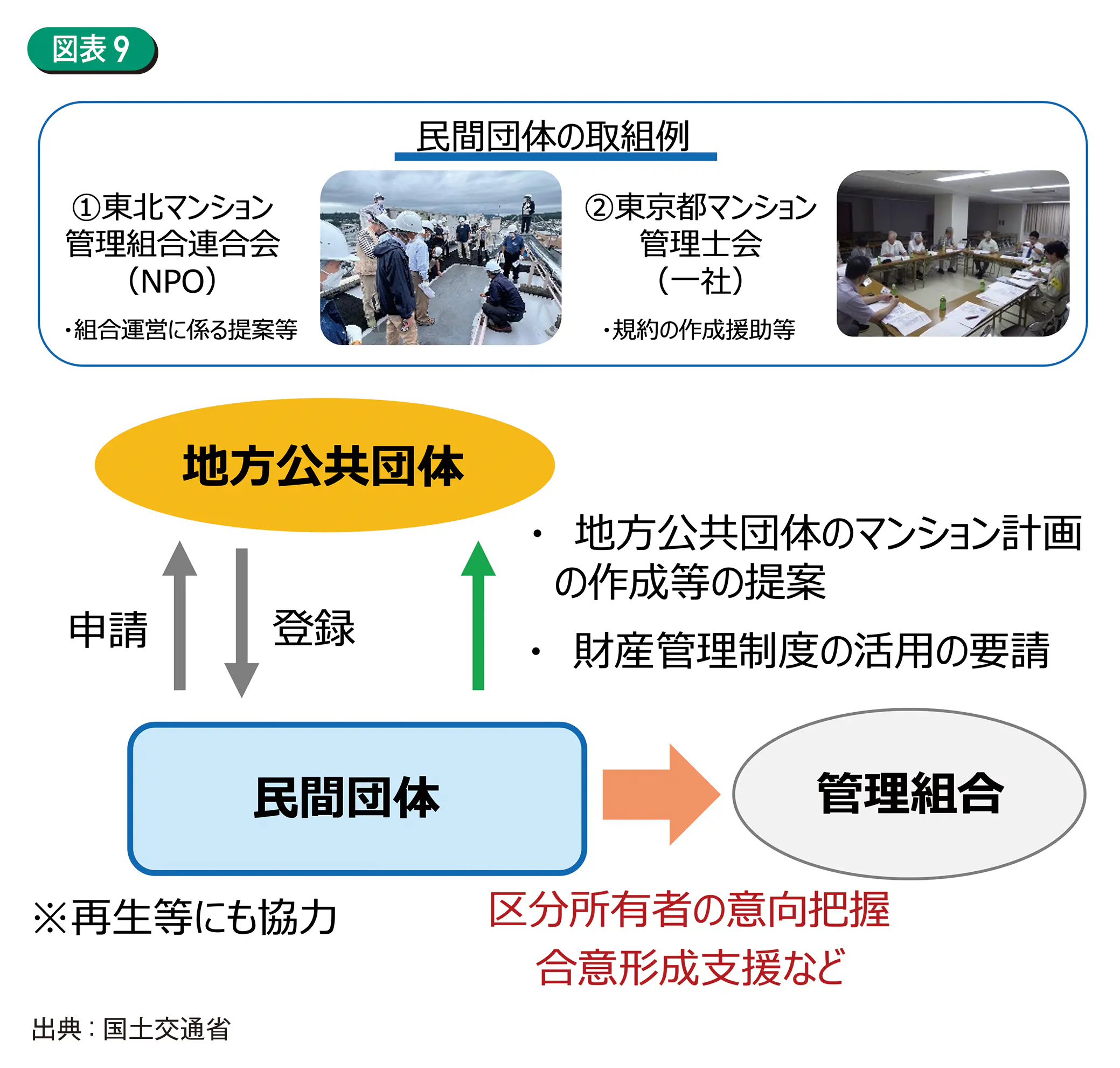 今回の法改正により、上述のような地方公共団体の権限の強化が図られることとなりますが、こうした権限の強化に伴う業務の増加にも対応するため、マンション管理等に取り組む民間団体とも連携し、その協力も得ながら、地域全体で管理組合の活動を支援する体制を構築していくことが重要です。このため、本改正法では、区分所有者の意向把握や合意形成の支援等の取組を行っている民間団体について、地方公共団体が「マンション管理適正化支援法人」として登録することができる制度を創設することといたしました(マンション管理法第5条の3~第5条の12)(図表9)。