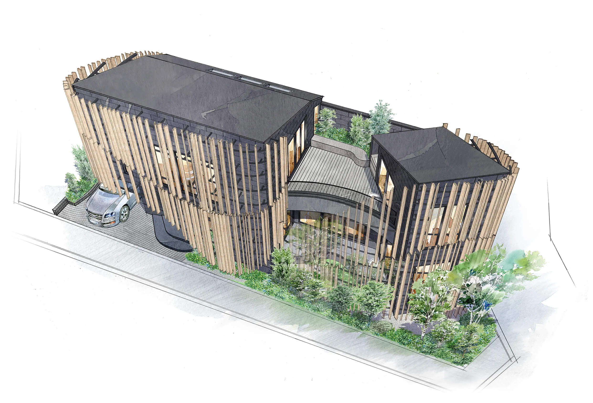 住まう人に家が調和してくれるように五感に響くテクノロジーの融合と安らぎを感じる曲面を取り入れた空間、自然(外部空間)との繋がりを意識したプランニング