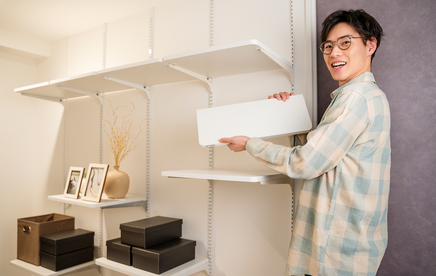 ▲Large-StorageやFit-Zoneには、壁面家具を後付けできる。背面支持金物を使用した「BF-Shelf」。棚の位置や高さを調節でき、収納を自在にアレンジ可能
