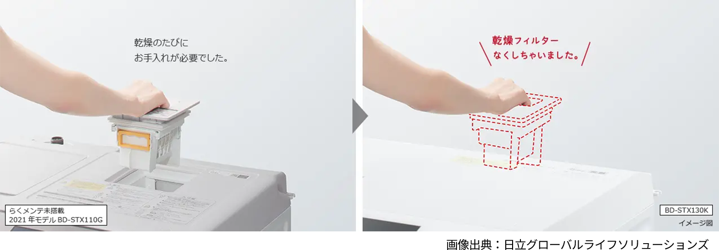 勝田:ドラム式洗濯機の故障の原因として最も多いのは、メンテナンス不足です。日立のドラム式洗濯乾燥機「BD-SX130K」は、洗濯機の上部にある乾燥フィルターをなくした「らくメンテ」で、お手入れを楽にしています。