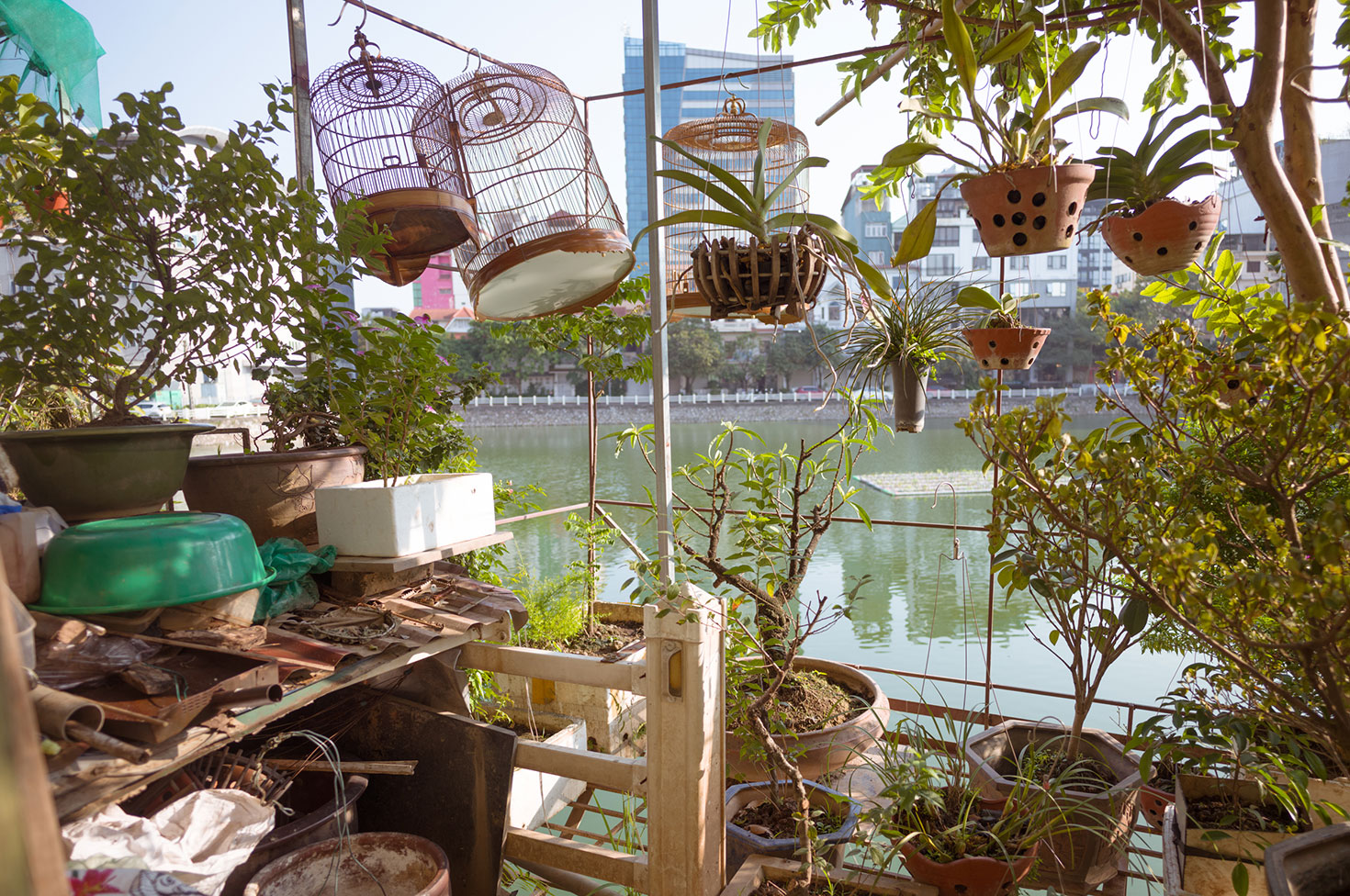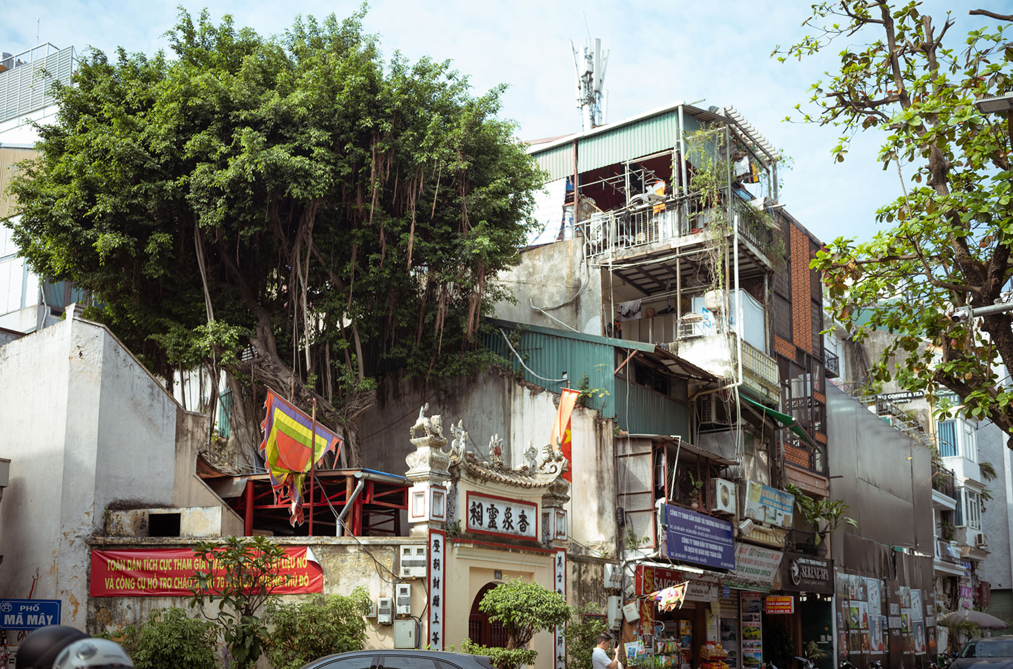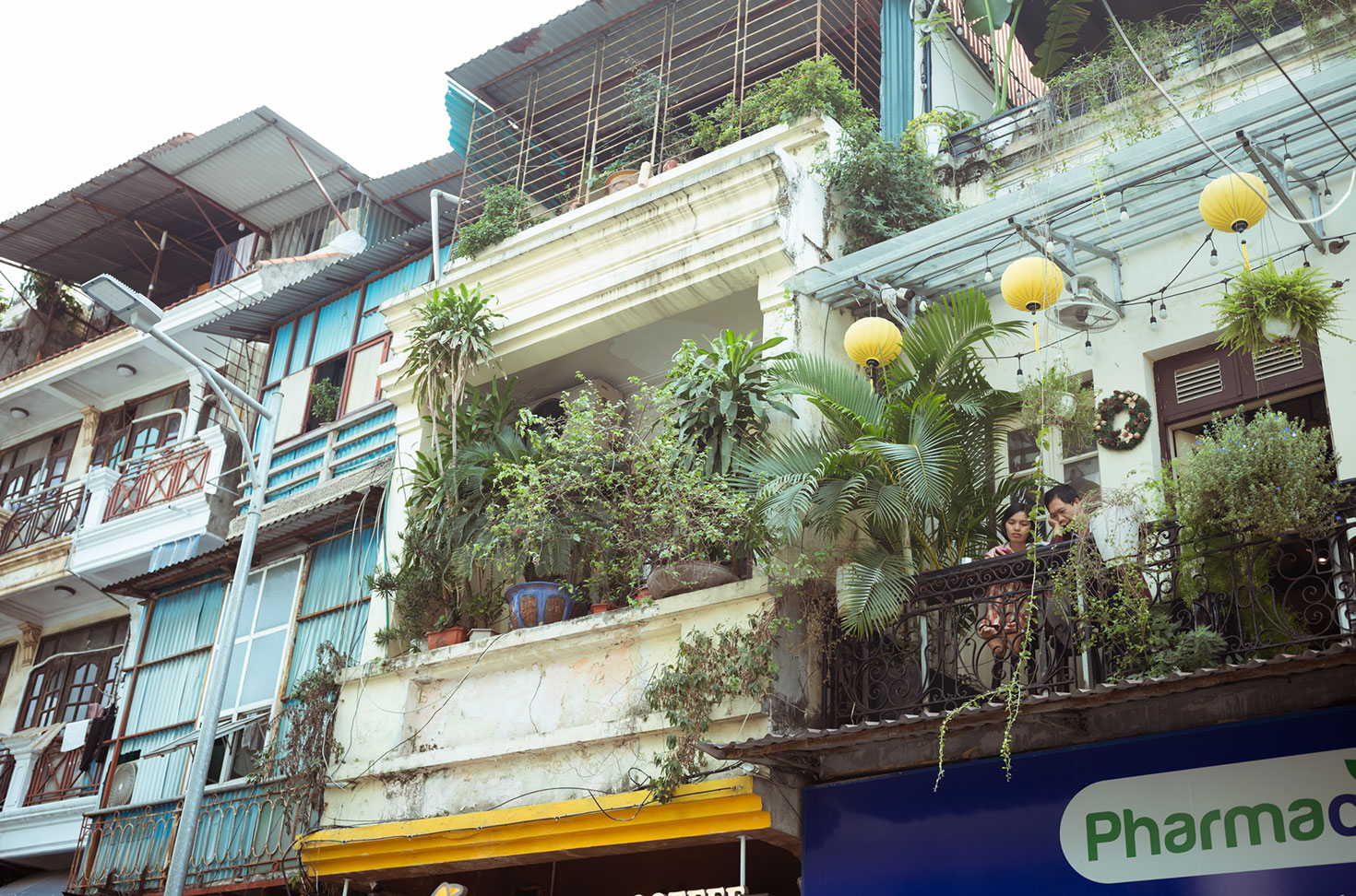 ファサードの造りも高さも色も素材もすべてがバラバラの建物が連なるハノイの旧市街。ツタのように絡まる電線、上階の窓、ベランダにぶら下がる植木、鳥かご、洗濯物などが装飾のように建物や街並みを彩る。