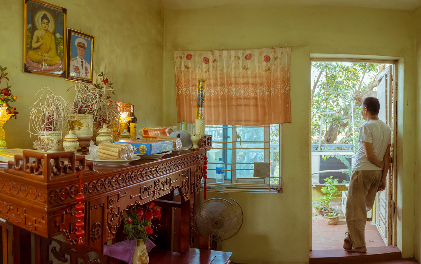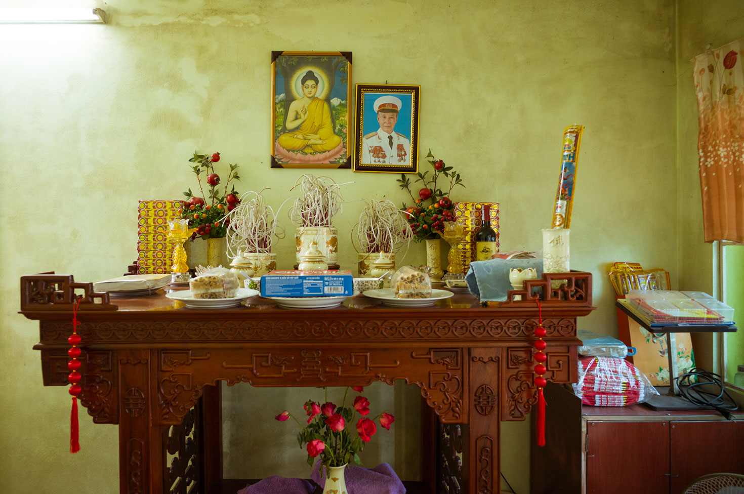 ▲祭壇には仏陀の肖像画とともに祖父の写真も飾られている。ベトナムでは、家ごとに祖先祭壇を設け、子孫が日常的に祈ることが根付いている