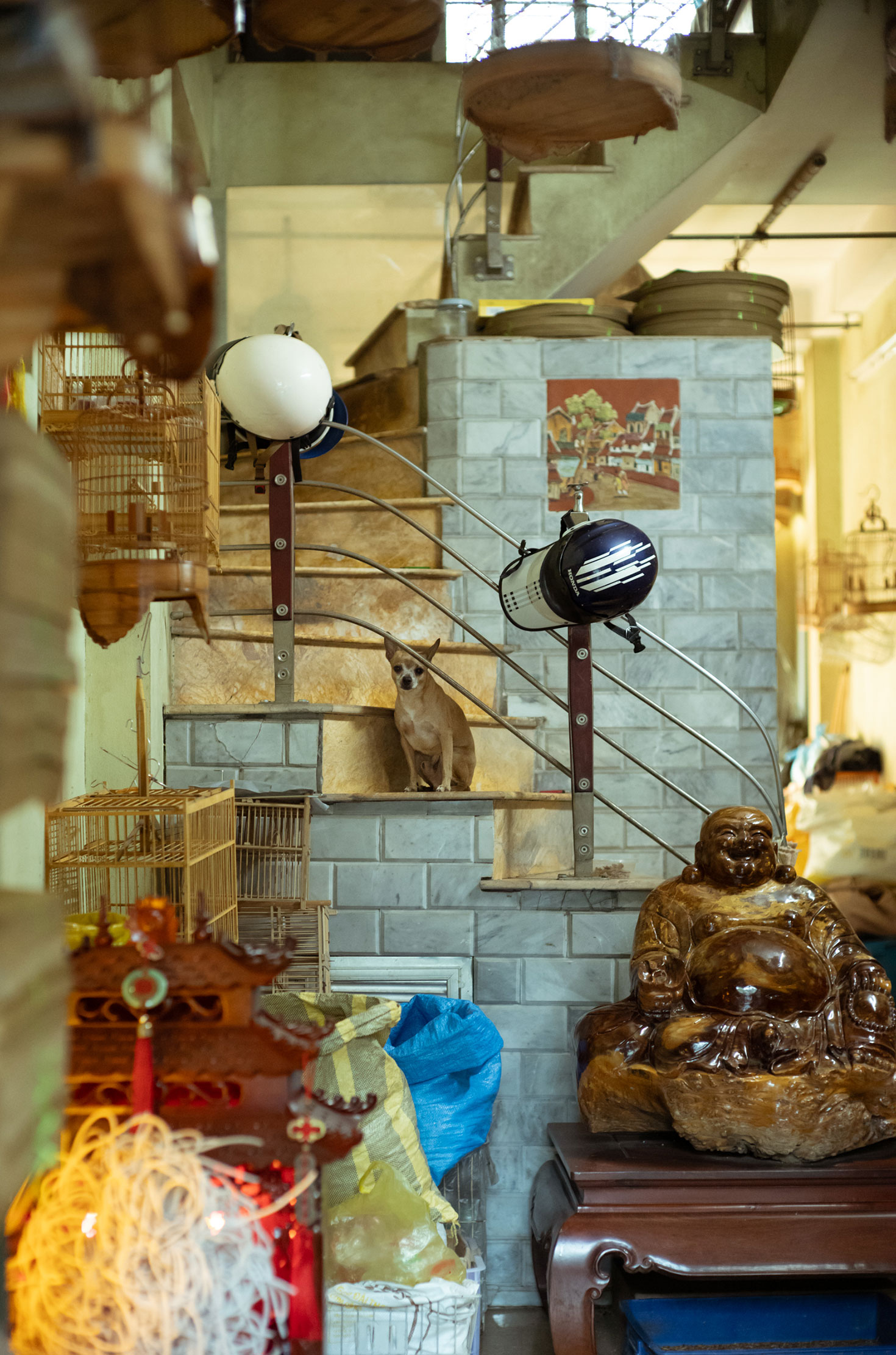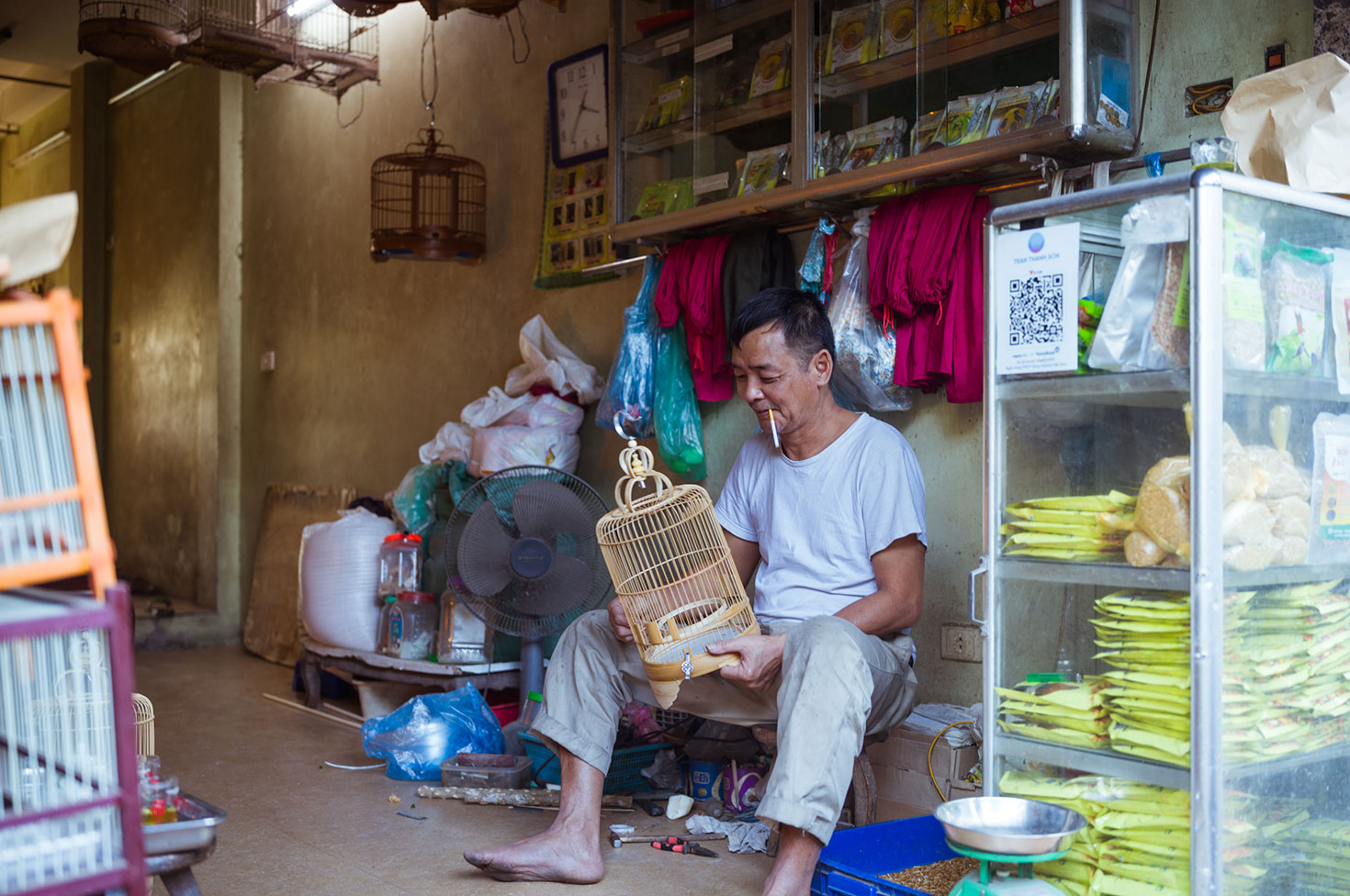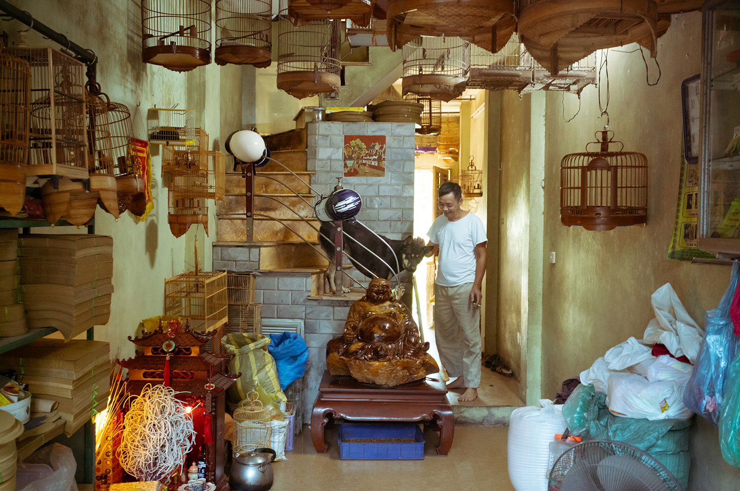 ▲鳥かご修理職人のタン・ソンさん。妻、娘、犬2匹とともに4階建てチューブハウスで暮らしている