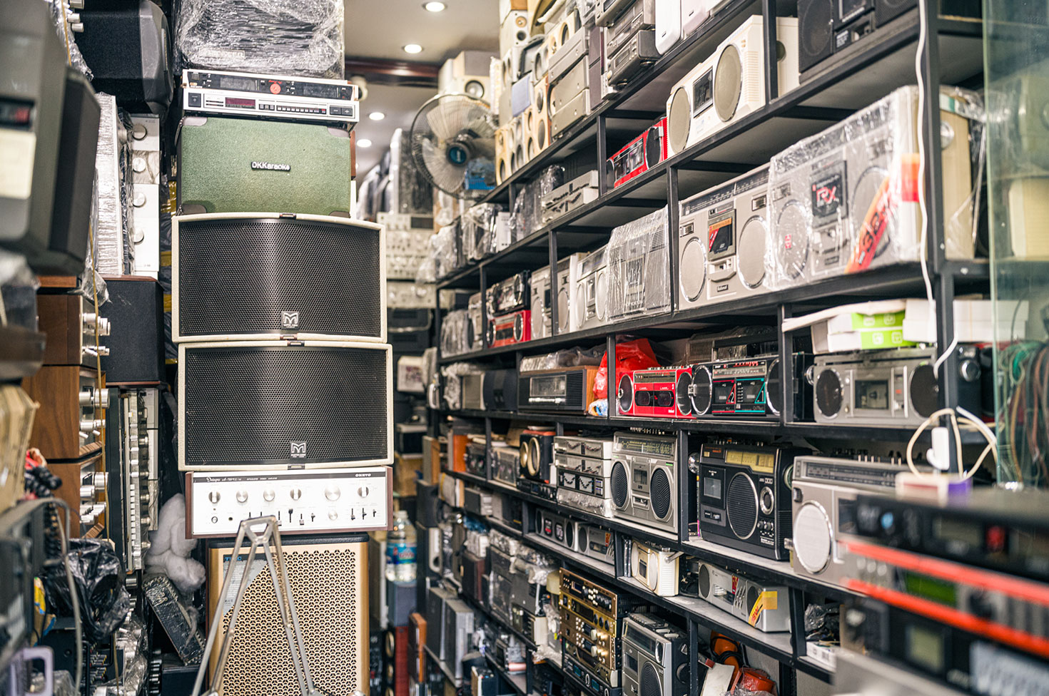 取材した鳥かご修理職人のタンさん宅チューブハウスのご近所に、目を引くお店があったので足を止めた。ここもまたチューブハウスだが、細い間口の両側には天井まで伸びる棚にビッシリとヴィンテージラジカセが並んでいる。