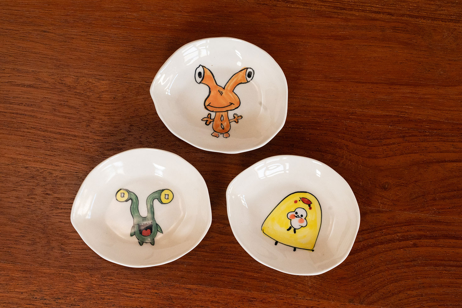 「豆皿に描かれている奇怪な絵が気になりました。アメリカの音楽家ダニエル・ジョンストンの描くイラストも彷彿とさせるゆるさですね。インスパイア系か偶然この作風にたどり着いたのかは分かりませんが、ご自宅の食卓にぜひ」