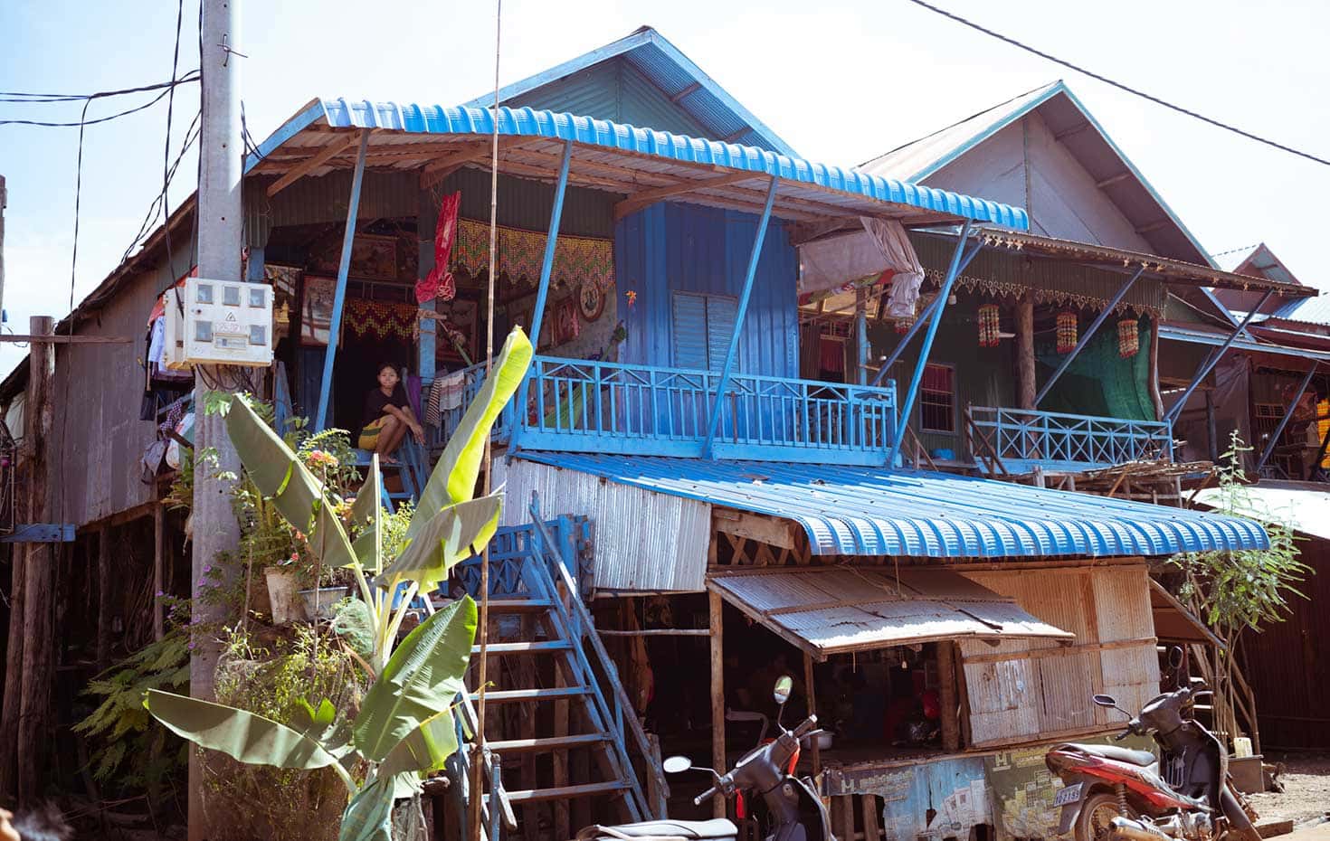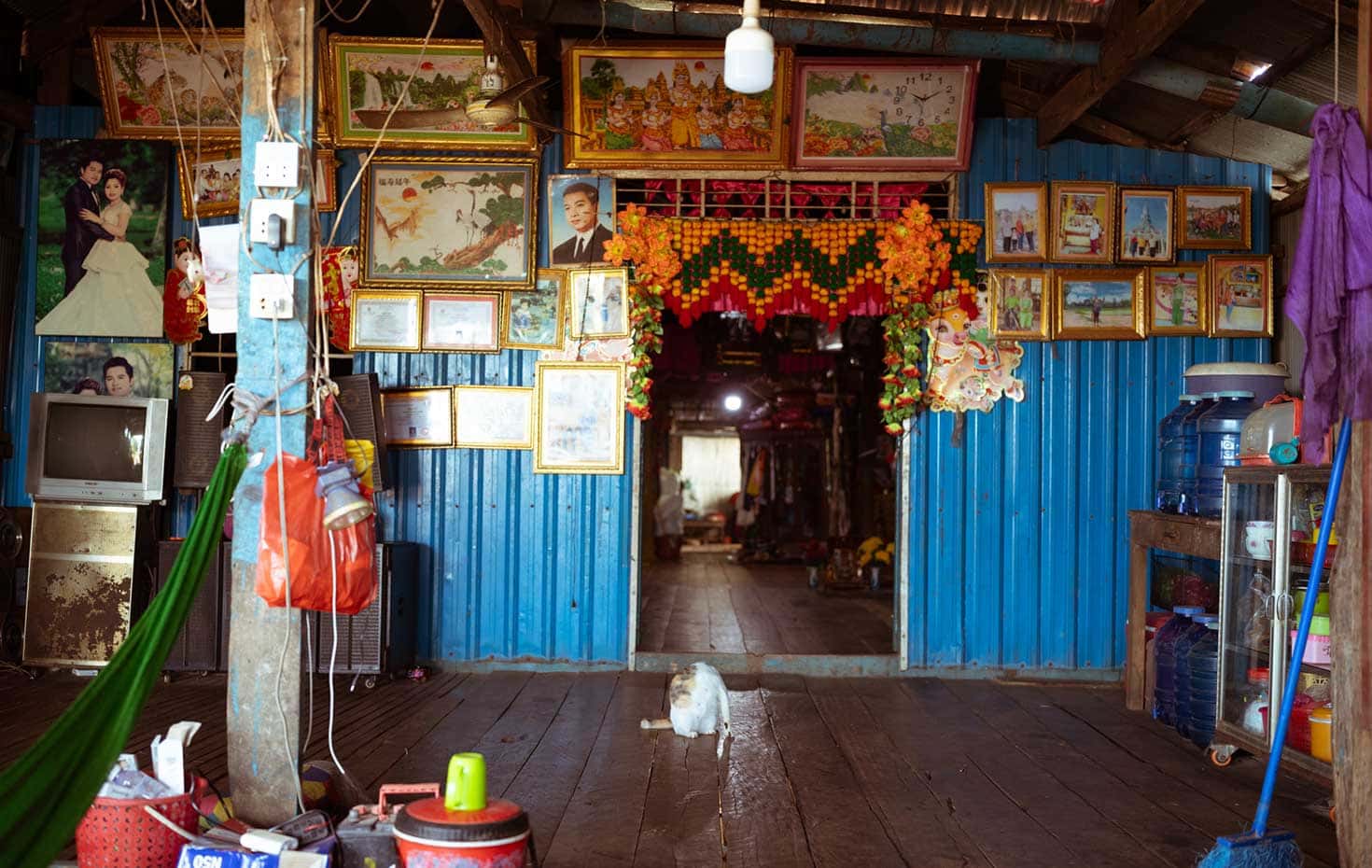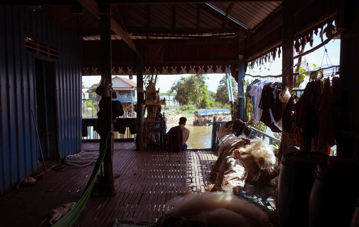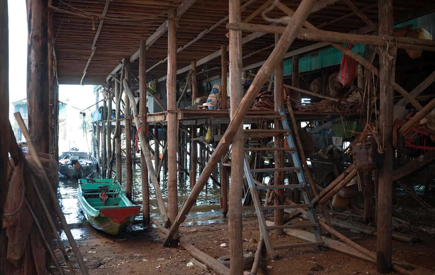 湿原の脇には、道と並行するように、トンレサップ湖に流れ込むロリュオス川が静かに流れている。車からボートに乗り換え、川をしばらく下ると、細長く伸びた柱で支えられ川面に浮かぶように立つ高床式の不思議な住居が見えてきた。