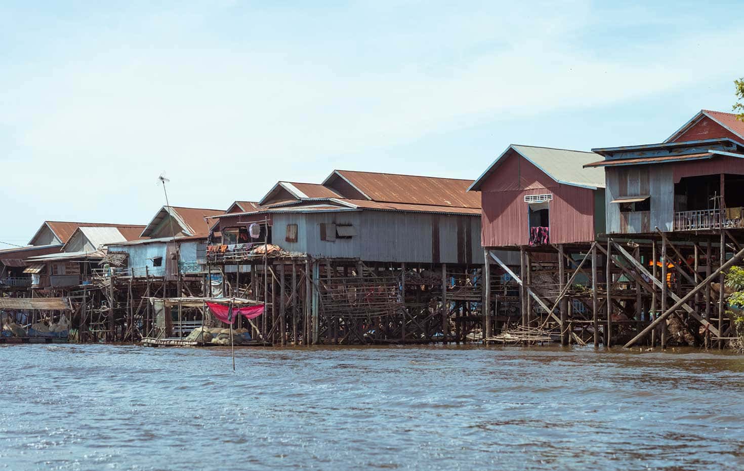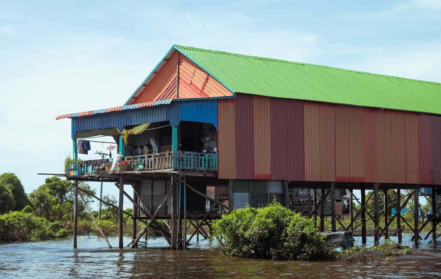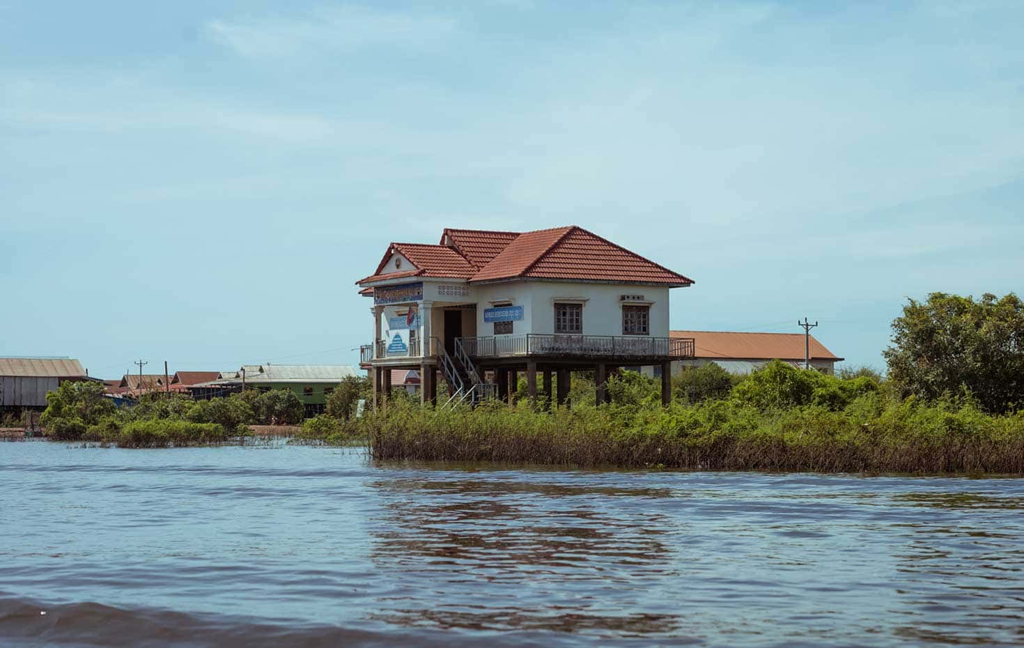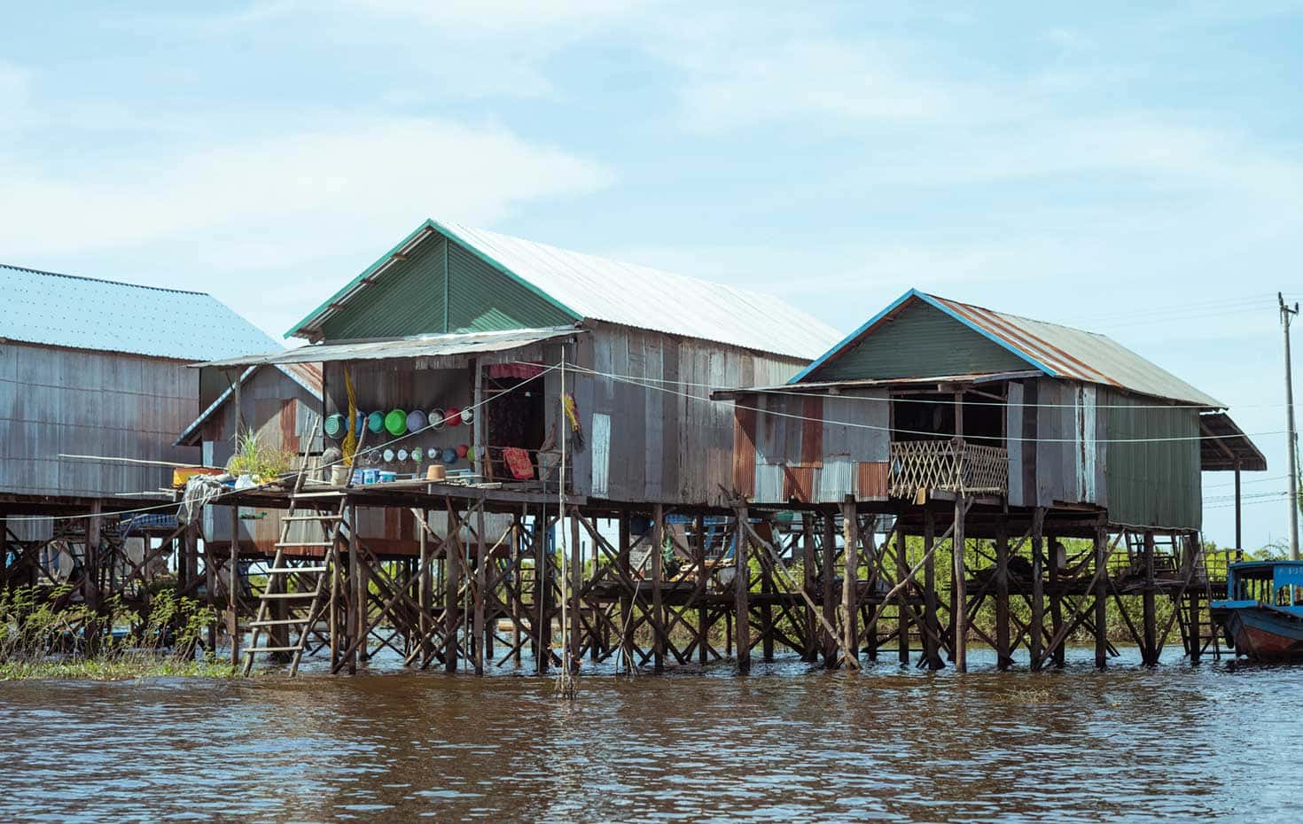 湿原の脇には、道と並行するように、トンレサップ湖に流れ込むロリュオス川が静かに流れている。車からボートに乗り換え、川をしばらく下ると、細長く伸びた柱で支えられ川面に浮かぶように立つ高床式の不思議な住居が見えてきた。